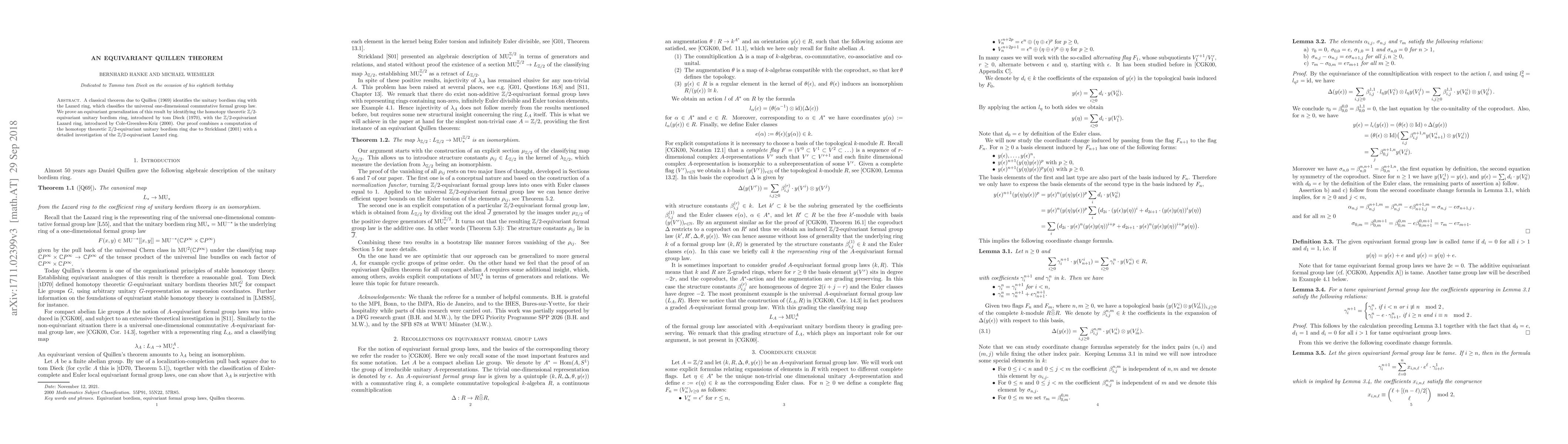 This paper generalizes Quillen's classical theorem by establishing an equivalence between the $\mathbb{Z}/2$-equivariant unitary bordism ring and the $\mathbb{Z}/2$-equivariant Lazard ring, combining Strickland's computation with a detailed study of the latter.