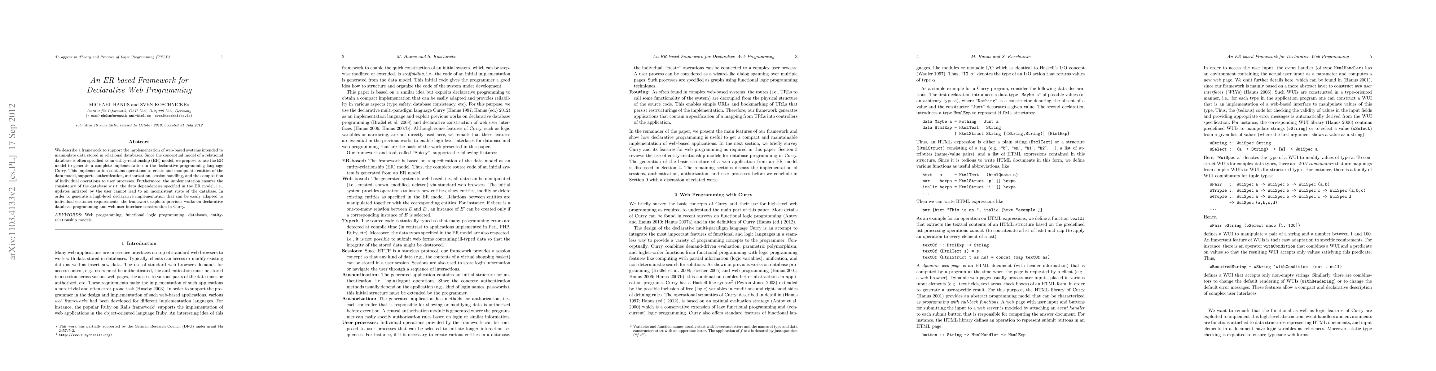 This paper proposes an ER-based framework for generating declarative web programming implementations in Curry, leveraging entity-relationship models to ensure database consistency and support for user authentication, authorization, and session management. The framework utilizes prior work on declarative database programming and web interfaces to create adaptable and consistent web-based systems.