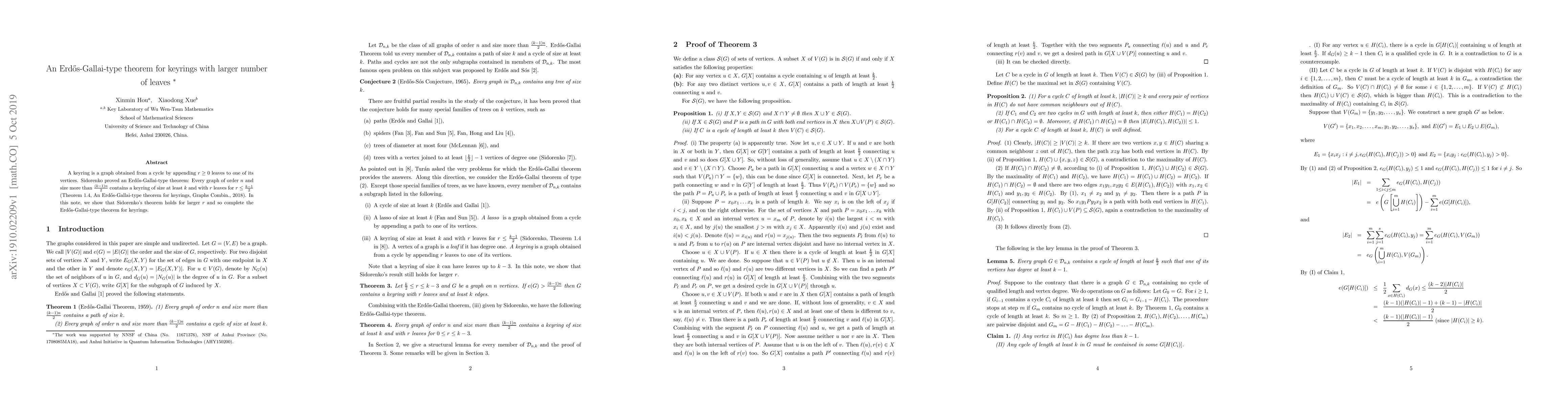 This research extends Sidorenko's Erdős-Gallai-type theorem on keyrings, proving that every sufficiently large graph contains a keyring of size at least $k$ with a larger number of leaves $r$, up to $k-1$, completing the theorem.