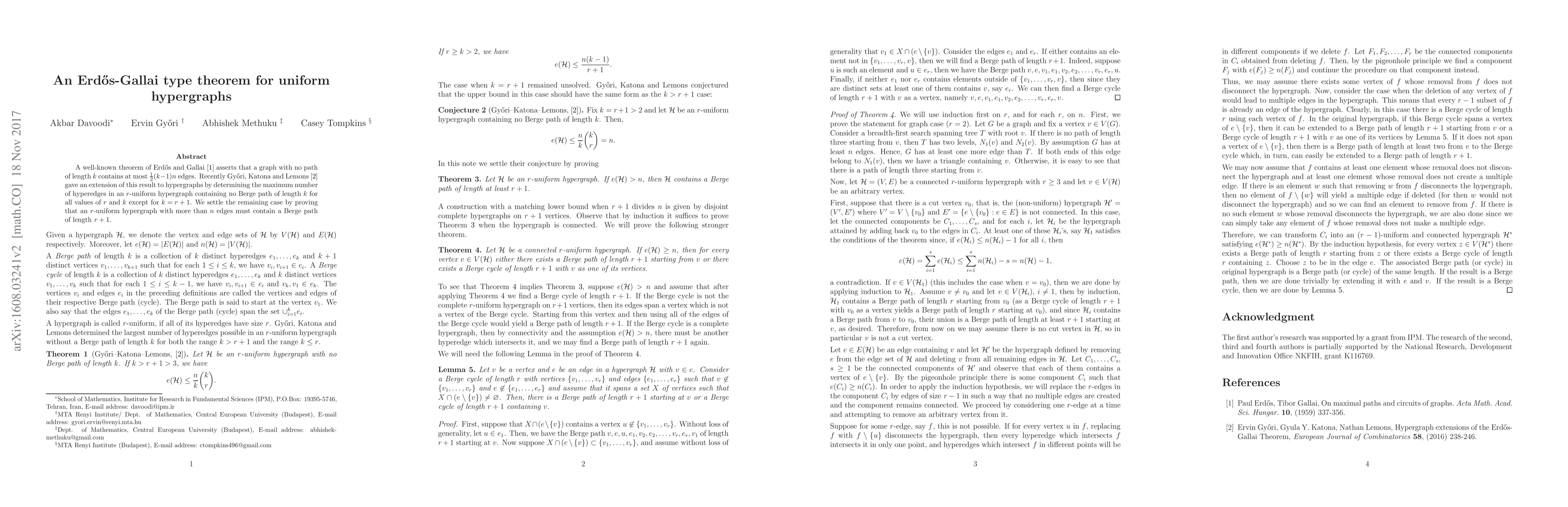 This paper proves an Erdős-Gallai type theorem for uniform hypergraphs, completing the extension of the original theorem to hypergraphs by showing that an $r$-uniform hypergraph with more than $n$ hyperedges must contain a Berge path of length $r+1$. This resolves the final case left open by previous results.