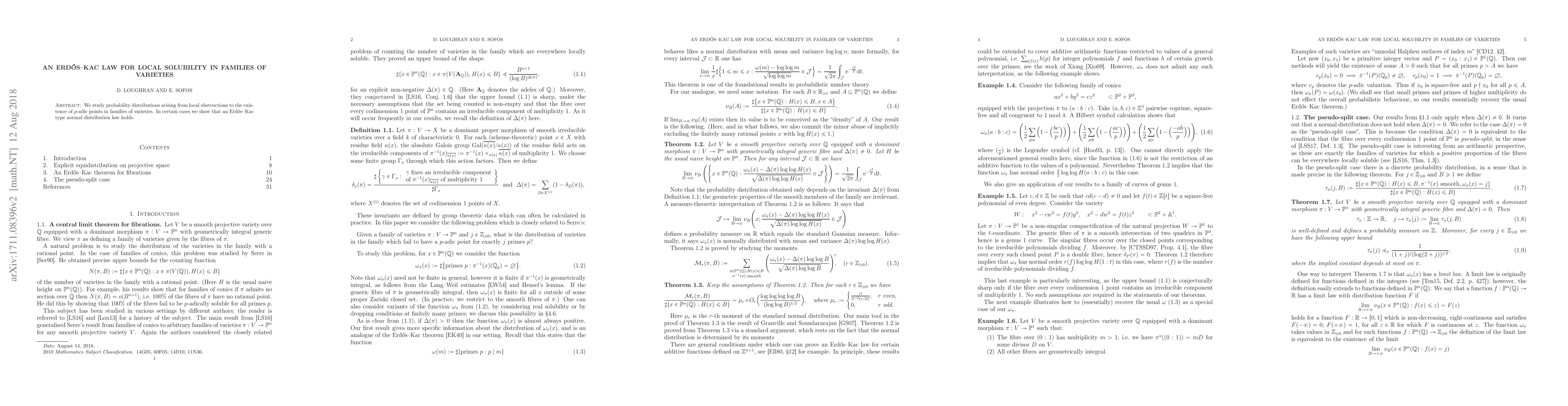 We study probability distributions arising from local obstructions to the existence of $p$-adic points in families of varieties. In certain cases we show that an Erd\H{o}s-Kac type law holds.