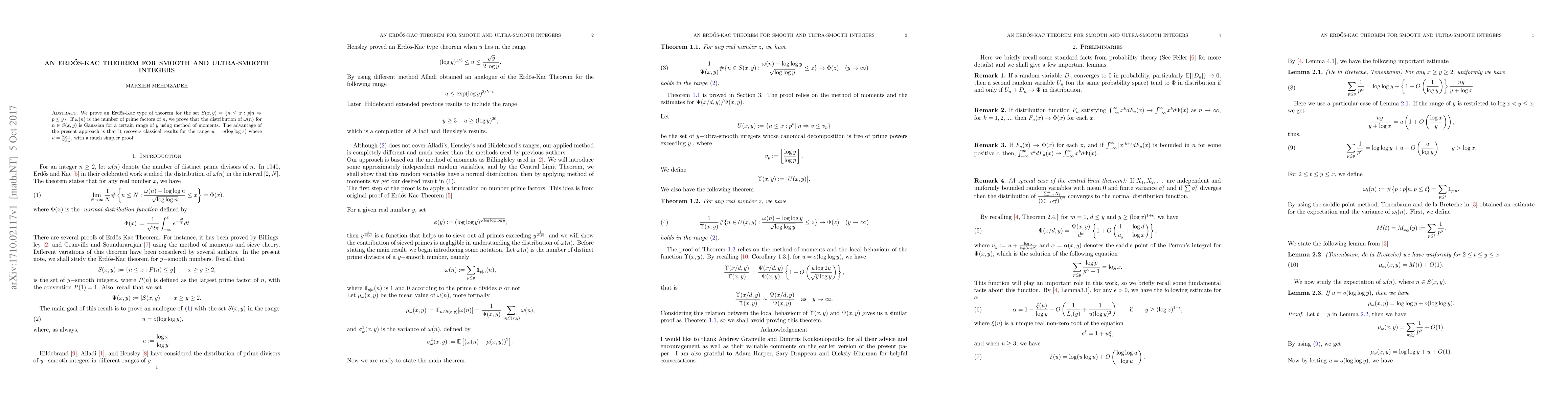 This paper proves an Erdős-Kac theorem for smooth and ultra-smooth integers, showing that the distribution of the number of prime factors for integers in the set $S(x,y)$ is Gaussian for a certain range of $y$, using a method of moments approach. The method provides a simpler proof for classical results when $u = o(\log \log x)$.