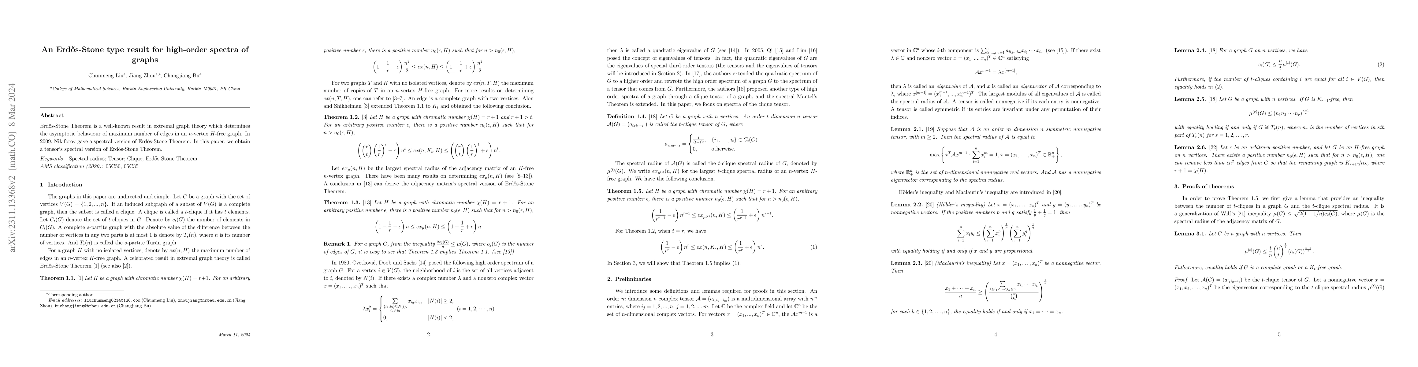 This paper extends the classical Erdős-Stone Theorem to high-order spectra of graphs, providing a spectral analogue that determines the asymptotic behavior of maximum edge density in $n$-vertex graphs avoiding a specific graph $H$, focusing on tensor spectral properties.