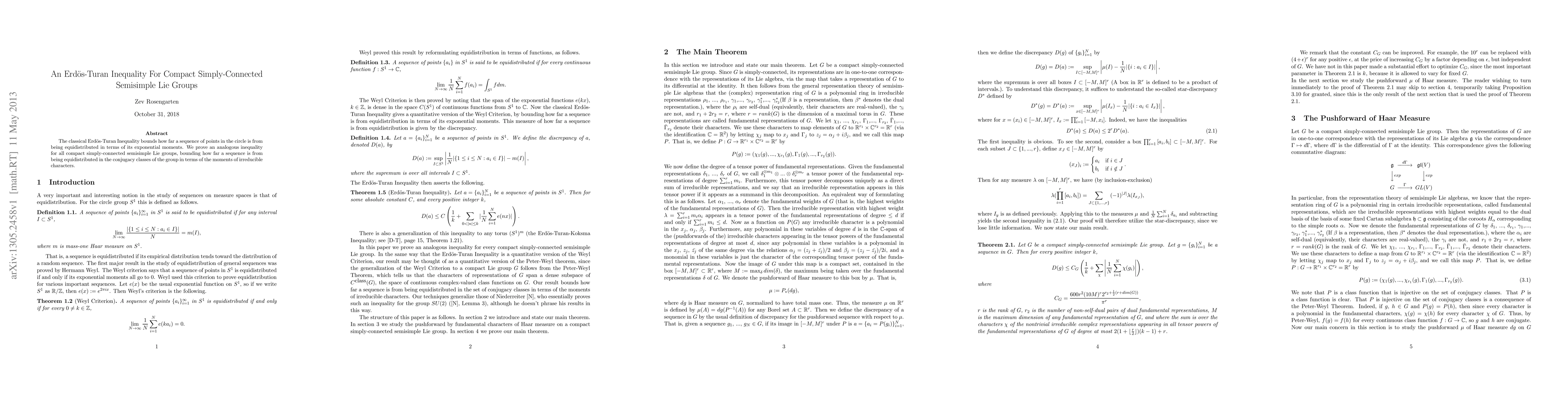 The classical Erd{\" o}s-Turan Inequality bounds how far a sequence of points in the circle is from being equidistributed in terms of its exponential moments. We prove an analogous inequality for all compact simply-connected semisimple Lie groups, bounding how far a sequence is from being equidistributed in the conjugacy classes of the group in terms of the moments of irreducible characters.