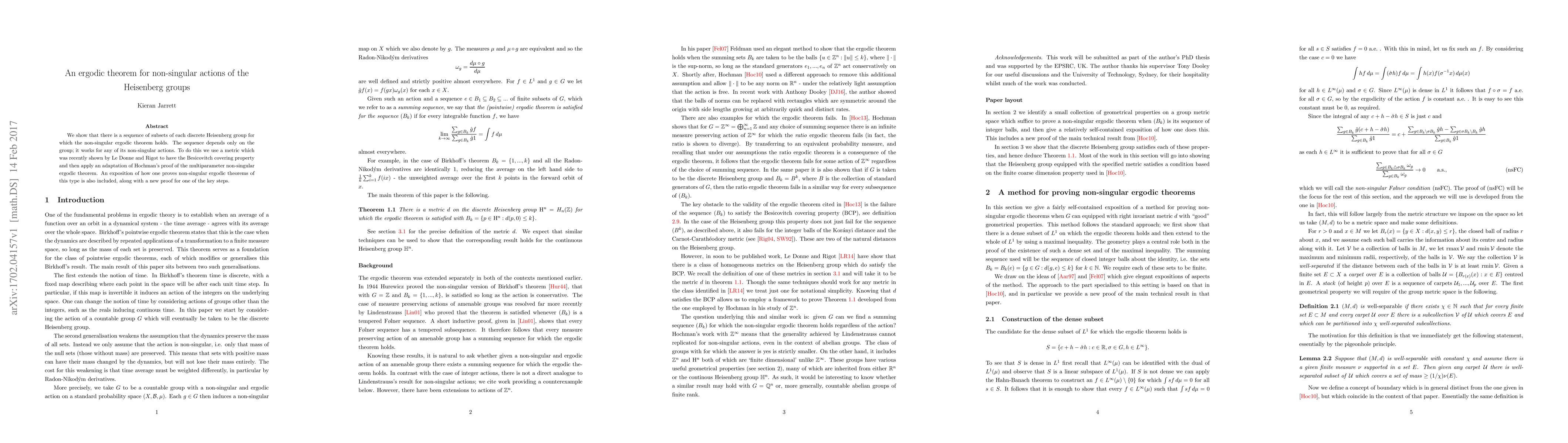 This paper establishes a non-singular ergodic theorem for discrete Heisenberg groups using a metric with the Besicovitch covering property, adapting Hochman's proof for multiparameter cases. It provides a sequence of subsets where the theorem applies universally across any non-singular action of the group.