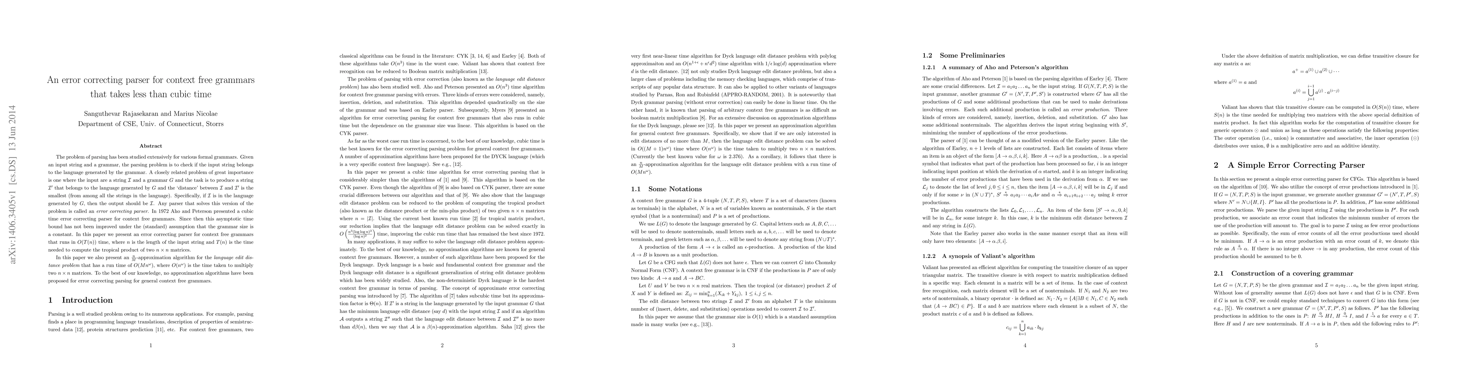 The problem of parsing has been studied extensively for various formal grammars. Given an input string and a grammar, the parsing problem is to check if the input string belongs to the language generated by the grammar. A closely related problem of great importance is one where the input are a string ${\cal I}$ and a grammar $G$ and the task is to produce a string ${\cal I}'$ that belongs to the language generated by $G$ and the `distance' between ${\cal I}$ and ${\cal I}'$ is the smallest (from among all the strings in the language). Specifically, if ${\cal I}$ is in the language generated by $G$, then the output should be ${\cal I}$. Any parser that solves this version of the problem is called an {\em error correcting parser}. In 1972 Aho and Peterson presented a cubic time error correcting parser for context free grammars. Since then this asymptotic time bound has not been improved under the (standard) assumption that the grammar size is a constant. In this paper we present an error correcting parser for context free grammars that runs in $O(T(n))$ time, where $n$ is the length of the input string and $T(n)$ is the time needed to compute the tropical product of two $n\times n$ matrices. In this paper we also present an $\frac{n}{M}$-approximation algorithm for the {\em language edit distance problem} that has a run time of $O(Mn^\omega)$, where $O(n^\omega)$ is the time taken to multiply two $n\times n$ matrices. To the best of our knowledge, no approximation algorithms have been proposed for error correcting parsing for general context free grammars.