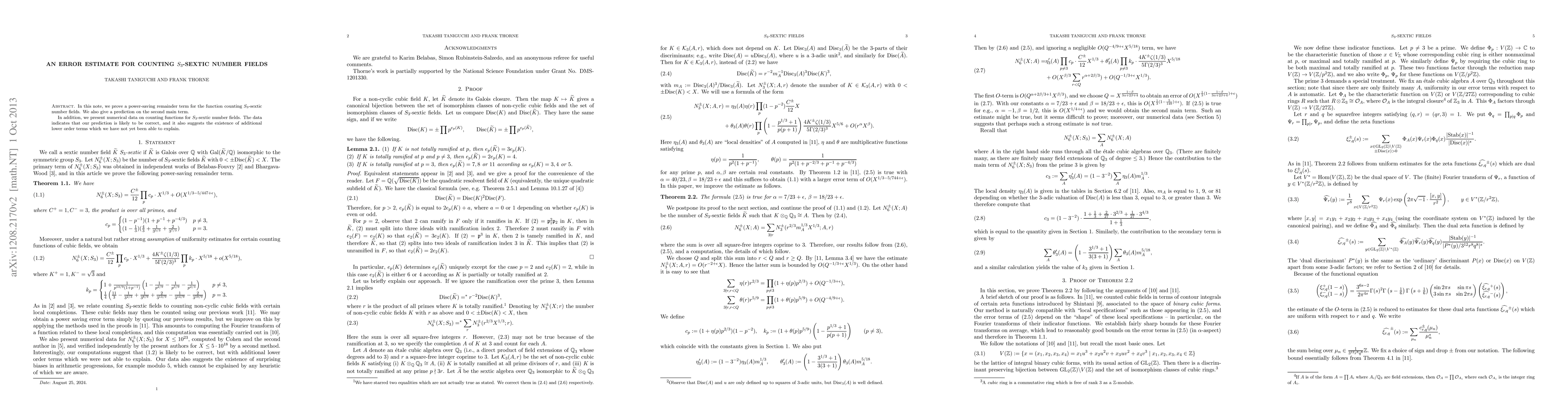In this note, we prove a power-saving remainder term for the function counting $S_3$-sextic number fields. We also give a prediction on the second main term. We also present numerical data on counting functions for $S_3$-sextic number fields. Our data indicates that our prediction is likely to be correct, and it also suggests the existence of additional lower order terms which we have not yet been able to explain.