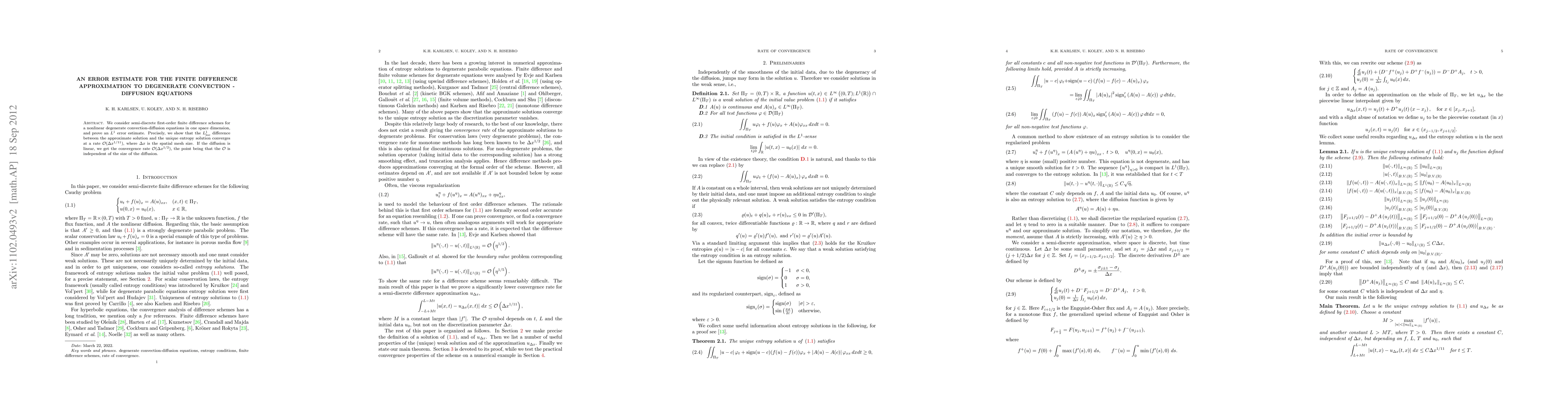 We consider semi-discrete first-order finite difference schemes for a nonlinear degenerate convection-diffusion equations in one space dimension, and prove an L1 error estimate. Precisely, we show that the L1 loc difference between the approximate solution and the unique entropy solution converges at a rate O(\Deltax 1/11), where \Deltax is the spatial mesh size. If the diffusion is linear, we get the convergence rate O(\Deltax 1/2), the point being that the O is independent of the size of the diffusion