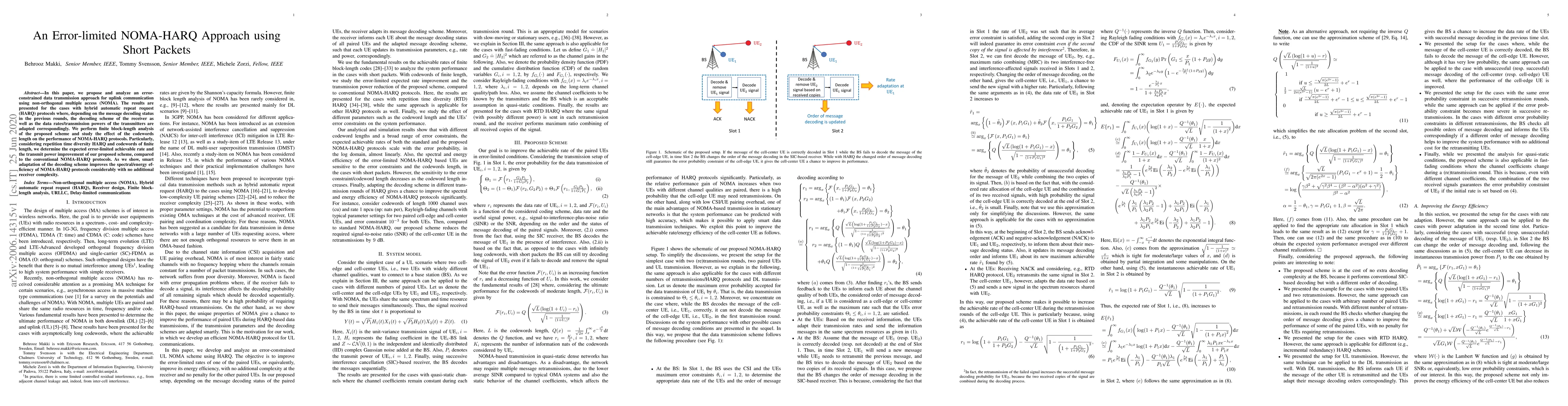 This paper proposes an error-constrained data transmission method for NOMA uplink communication using short packets and adaptive HARQ protocols. The study shows improved spectral and energy efficiency through smart decoding scheme adaptation, achieving better performance compared to conventional NOMA-HARQ.