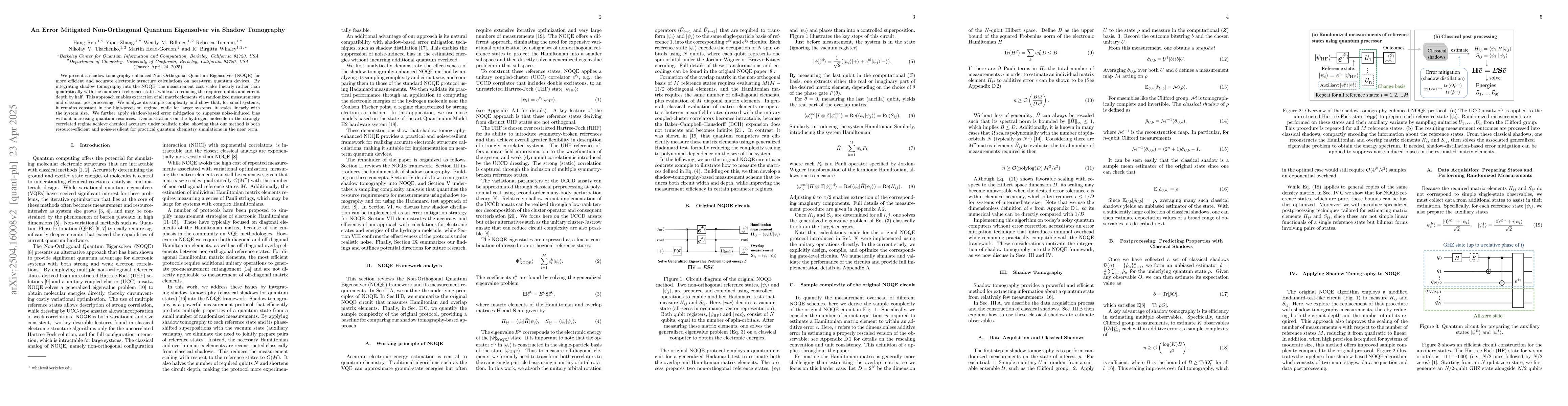 The research presents a shadow-tomography-enhanced Non-Orthogonal Quantum Eigensolver (NOQE) for efficient and accurate electronic structure calculations on near-term quantum devices, reducing qubit requirements, circuit depth, and measurement overhead.