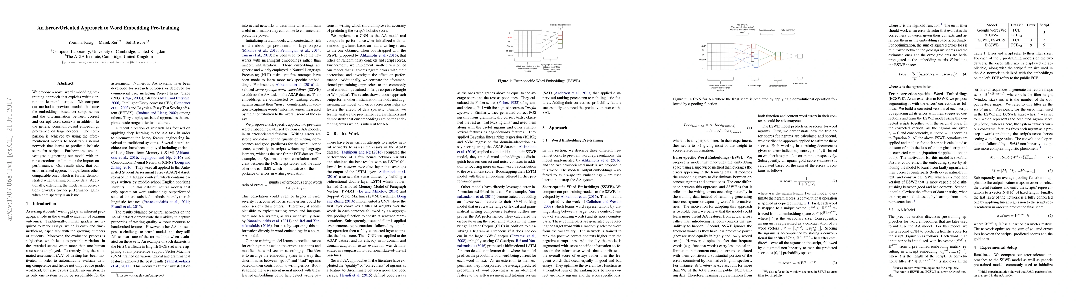 We propose a novel word embedding pre-training approach that exploits writing errors in learners' scripts. We compare our method to previous models that tune the embeddings based on script scores and the discrimination between correct and corrupt word contexts in addition to the generic commonly-used embeddings pre-trained on large corpora. The comparison is achieved by using the aforementioned models to bootstrap a neural network that learns to predict a holistic score for scripts. Furthermore, we investigate augmenting our model with error corrections and monitor the impact on performance. Our results show that our error-oriented approach outperforms other comparable ones which is further demonstrated when training on more data. Additionally, extending the model with corrections provides further performance gains when data sparsity is an issue.