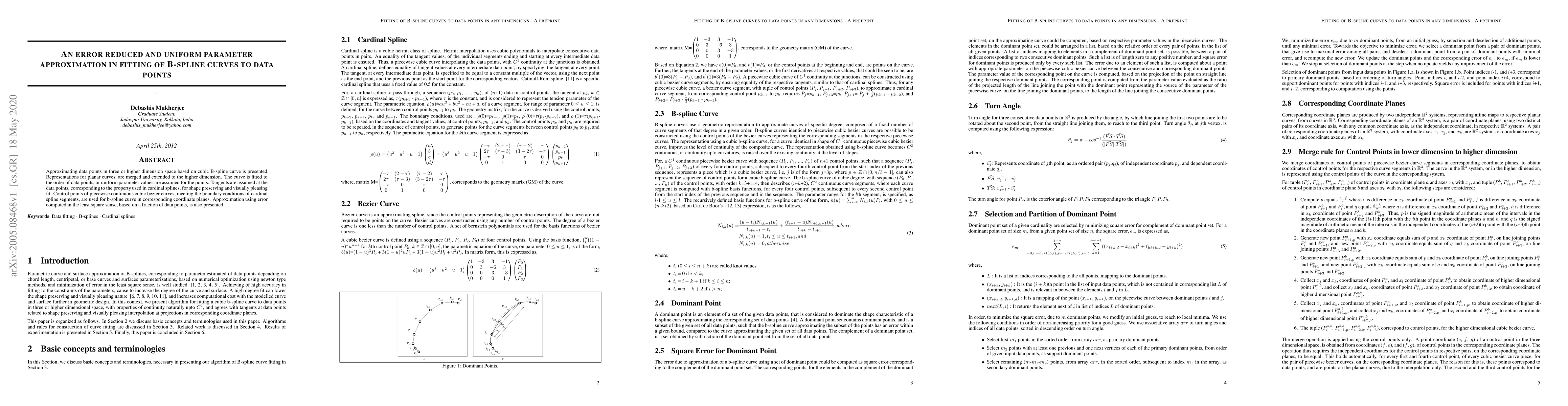 This paper presents a method for fitting cubic B-spline curves to data points in three or higher dimensions, ensuring uniform parameter approximation and shape-preserving tangents at data points. It utilizes control points from piecewise continuous cubic Bezier curves and employs least squares error computation for optimal approximation.
