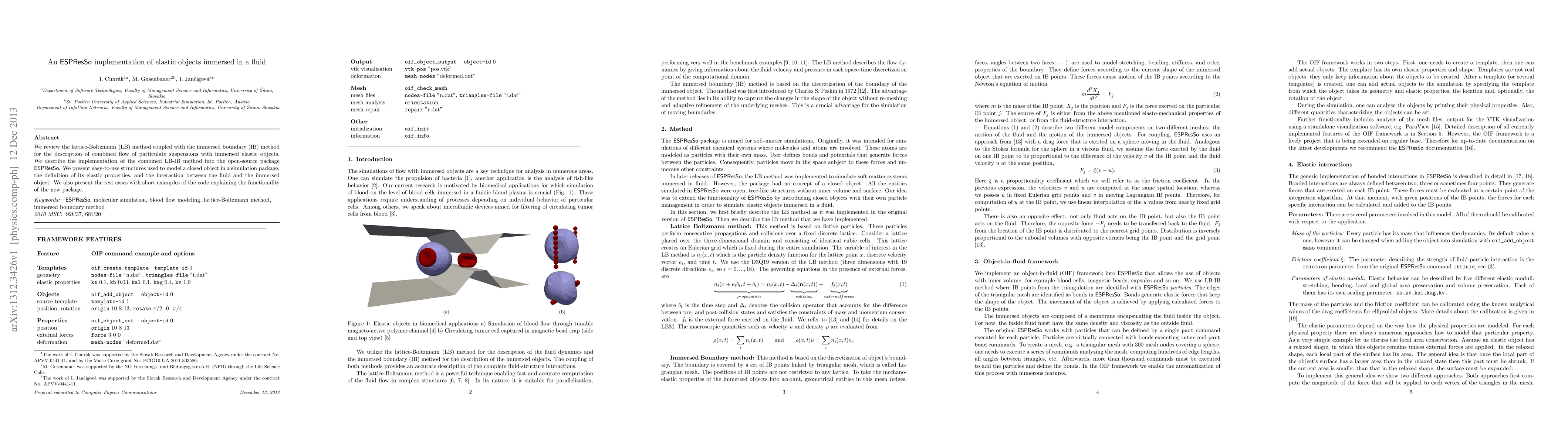 This paper details the implementation of a combined lattice-Boltzmann and immersed boundary method in the ESPResSo package to simulate elastic objects in fluid flow. It provides structures for modeling elastic objects and demonstrates the method with test cases and code examples.