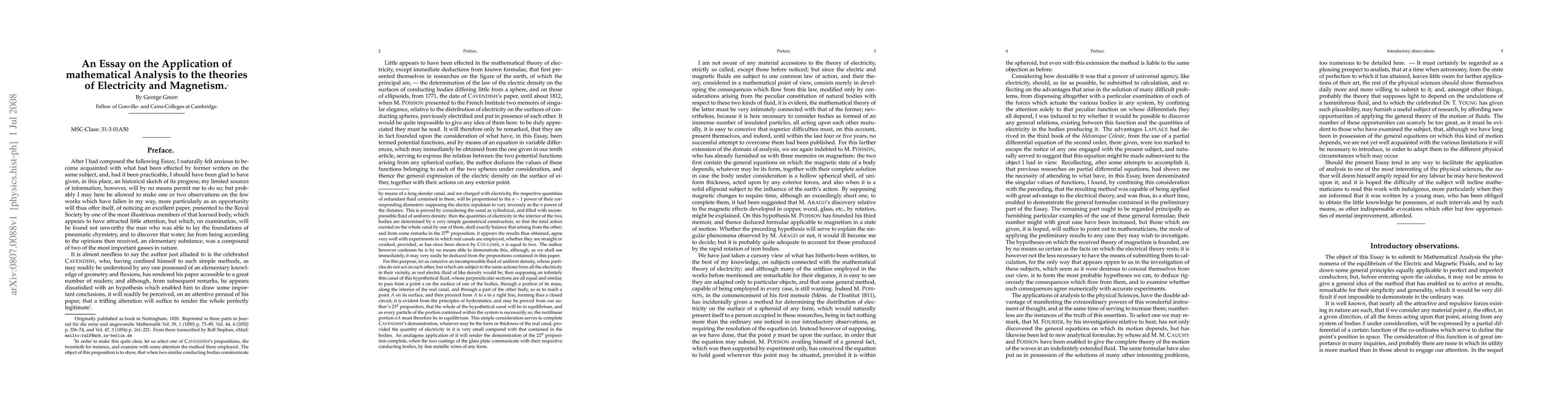 Green's 1828 essay introduced the potential function and applied mathematical analysis to theories of electricity and magnetism. The essay, reprinted with corrections, outlines prior work, presents formal calculations, and solves related problems.