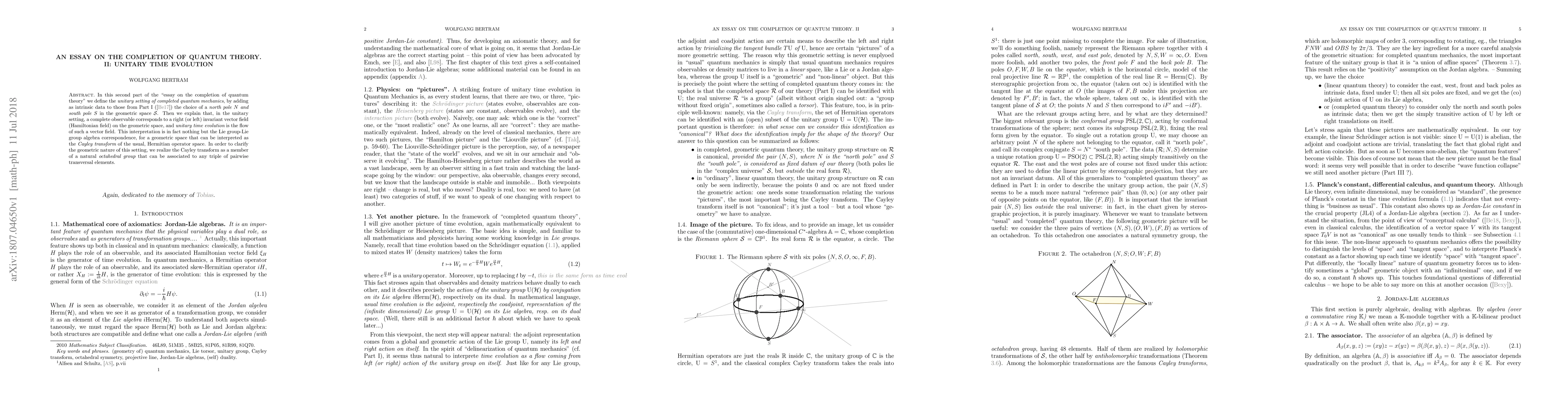 In this second part of the `essay on the completion of quantum theory' we define the {\em unitary setting of completed quantum mechanics}, by adding as intrinsic data to those from Part I (arXiv:1711.08643) the choice of a north pole N and south pole S in the geometric space. Then we explain that, in the unitary setting, a complete observable corresponds to a right (or left) invariant vector field (Hamiltonian field) on the geometric space, and {\em unitary time evolution} is the flow of such a vector field. This interpretation is in fact nothing but the Lie group-Lie group algebra correspondence, for a geometric space that can be interpreted as the Cayley transform of the usual, Hermitian operator space. In order to clarify the geometric nature of this setting, we realize the Cayley transform as a member of a natural octahedral group that can be associated to any triple of pairwise transversal elements.