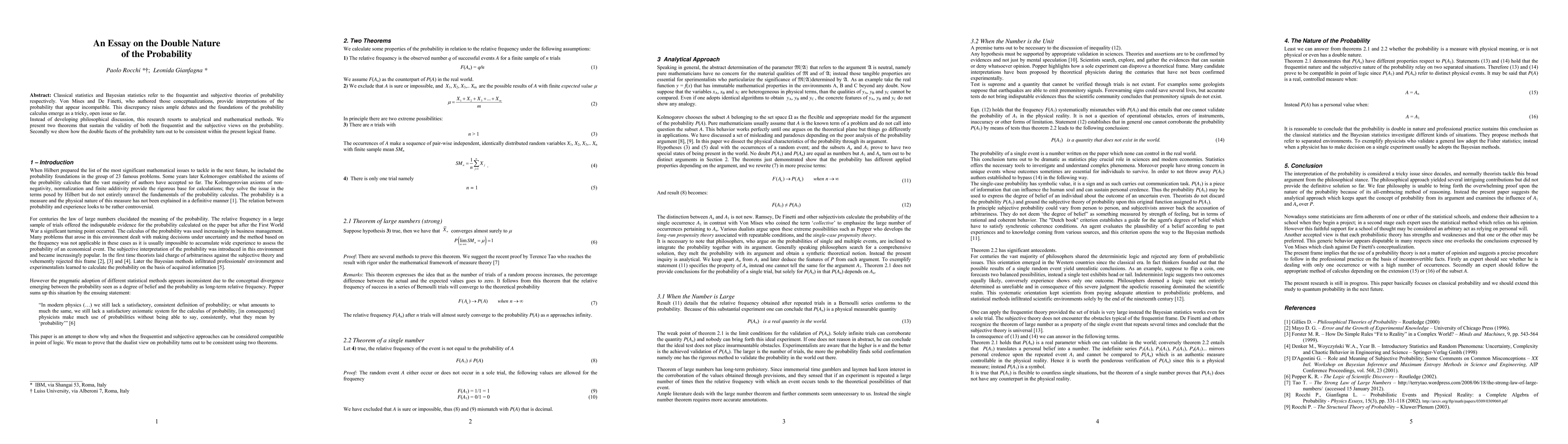Classical statistics and Bayesian statistics refer to the frequentist and subjective theories of probability respectively. Von Mises and De Finetti, who authored those conceptualizations, provide interpretations of the probability that appear incompatible. This discrepancy raises ample debates and the foundations of the probability calculus emerge as a tricky, open issue so far. Instead of developing philosophical discussion, this research resorts to analytical and mathematical methods. We present two theorems that sustain the validity of both the frequentist and the subjective views on the probability. Secondly we show how the double facets of the probability turn out to be consistent within the present logical frame.