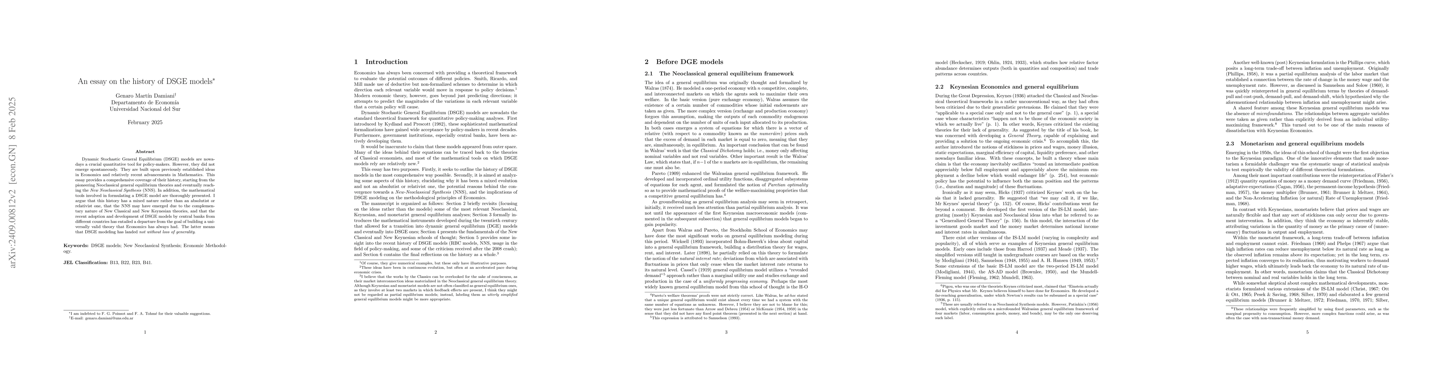 Dynamic Stochastic General Equilibrium (DSGE) models, which are nowadays a crucial element of the set of quantitative tools that policy-makers have, did not emerge spontaneously. They rely on previously established ideas in Economics and relatively recent advancements in Mathematics. I aim to provide a comprehensive coverage of their history, starting from the pioneering Neoclassical general equilibrium theories and eventually reaching the New Neoclassical Synthesis (NNS). I thoroughly present the mathematical tools involved in formulating a DSGE model. I claim that this history has a mixed nature rather than an absolutist or relativist one, that the NNS may have emerged due to the complementary nature of New Classical and New Keynesian theories, and that the recent adoption and development of DSGE models by central banks from different countries has entailed a departure from the goal of building a universally valid theory that Economics has always had. The latter means that DSGE modeling has landed not without loss of generality.