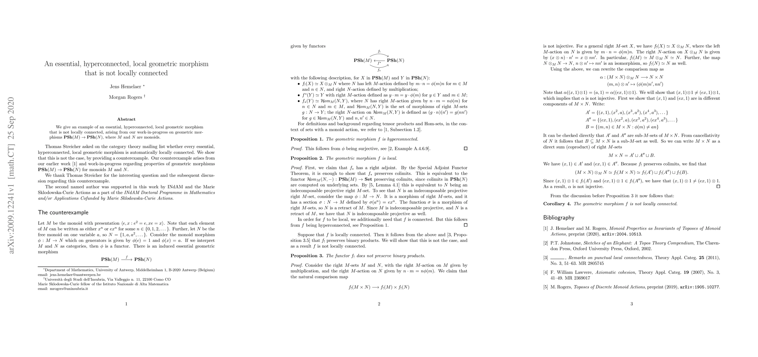 Summary: This paper presents an example of an essential, hyperconnected local geometric morphism that defies the locally connected property, contributing to ongoing research on geometric morphisms between monoidal categories. The findings challenge existing assumptions about local connections in such morphisms.
