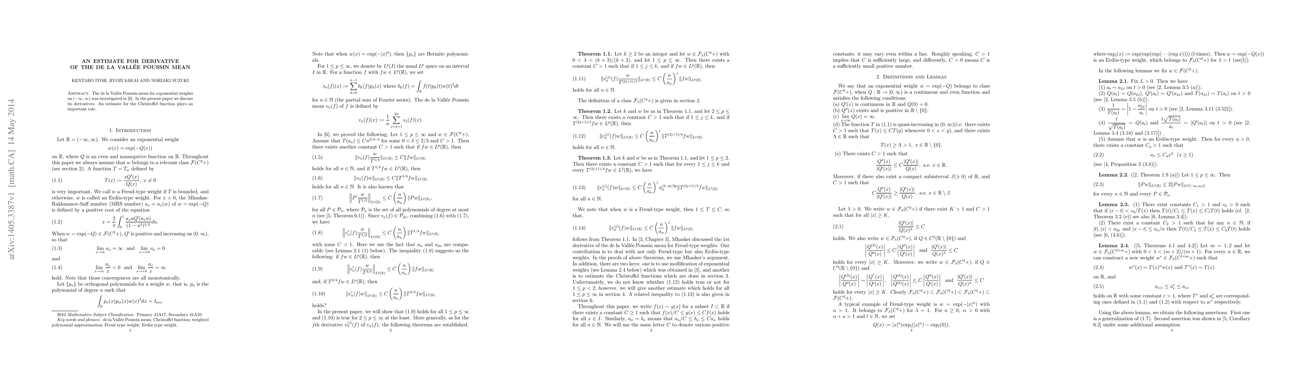 Summary: This paper estimates the derivative of the de la Vallee Poussin mean for exponential weights on the real line, utilizing an inequality where an estimate for the Christoffel function is crucial.