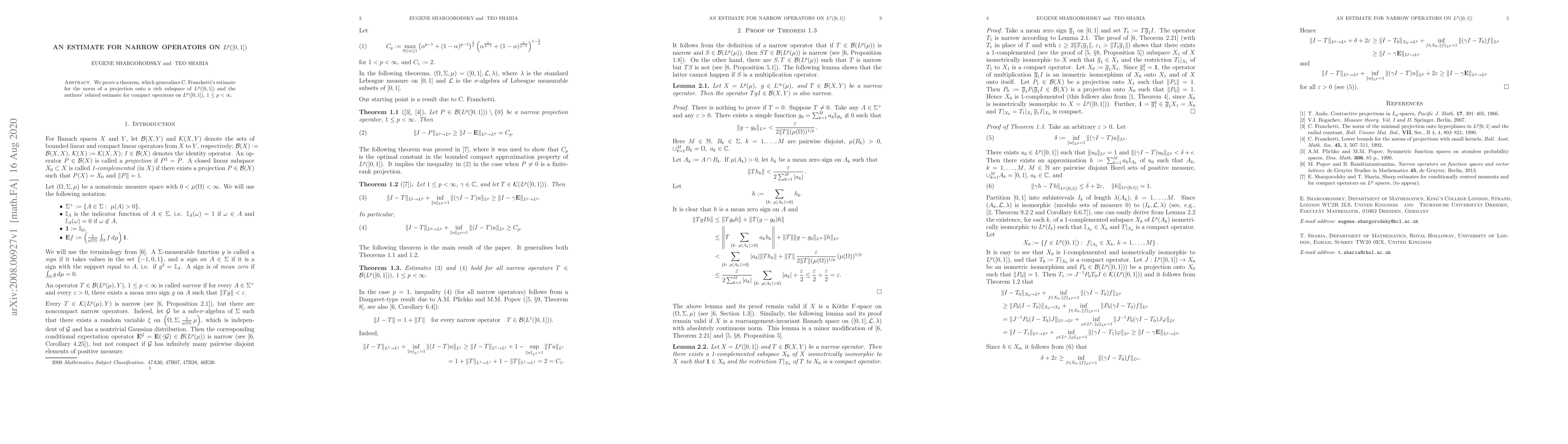 We prove a theorem, which generalises C. Franchetti's estimate for the norm of a projection onto a rich subspace of $L^p([0, 1])$ and the authors' related estimate for compact operators on $L^p([0, 1])$, $1 \le p < \infty$.