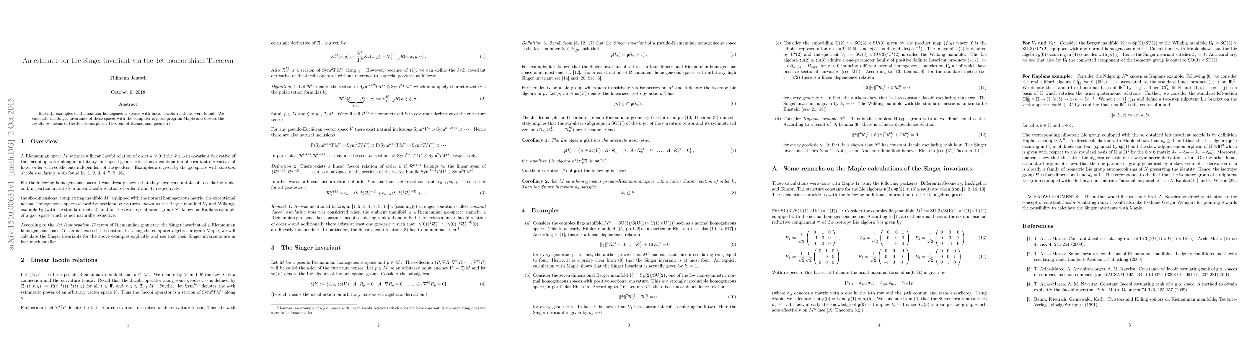 Summary: This paper calculates Singer invariants for Riemannian homogeneous spaces with linear Jacobi relations using Maple and interprets the results through the Jet Isomorphism Theorem in pseudo-Riemannian geometry.