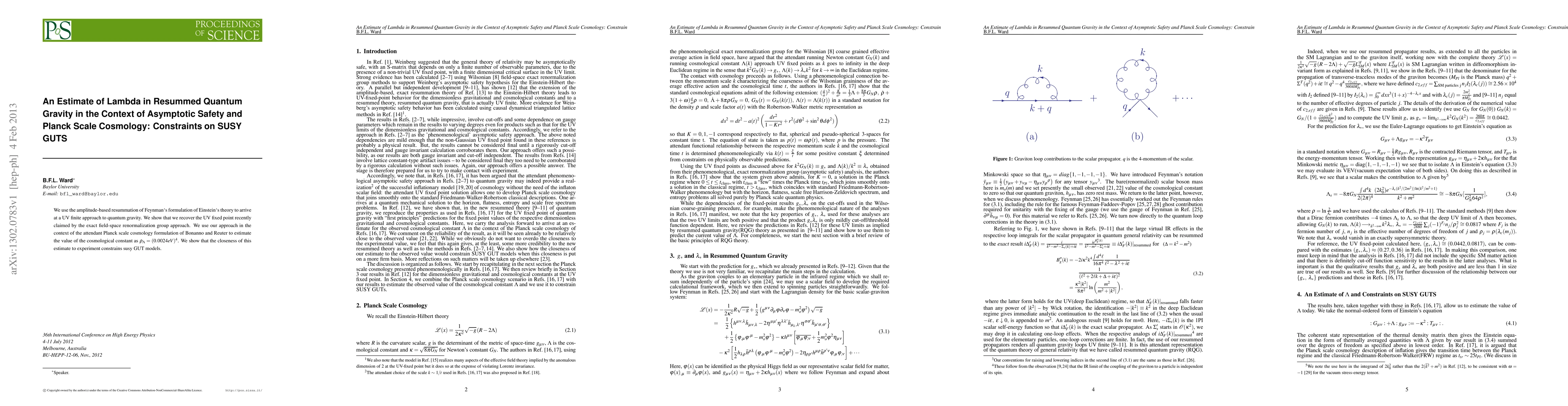 We use the amplitude-based resummation of Feynman`s formulation of Einstein`s theory to arrive at a UV finite approach to quantum gravity. We show that we recover the UV fixed point recently claimed by the exact field-space renormalization group approach. We use our approach in the context of the attendant Planck scale cosmology formulation of Bonanno and Reuter to estimate the value of the cosmological constant as \rho_\Lambda=(0.0024 eV)^4. We show that the closeness of this estimate to experiment constrains susy GUT models.