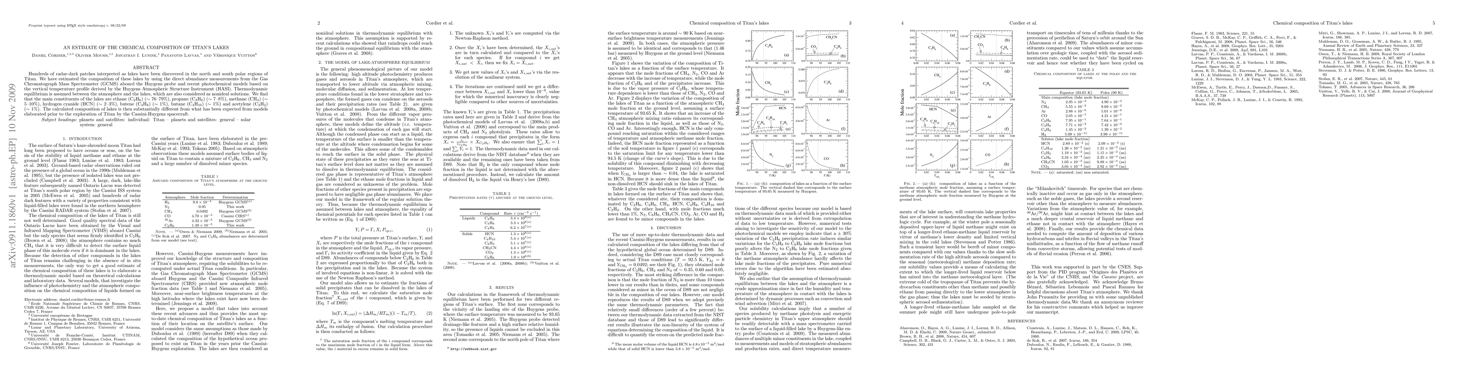 Hundreds of radar-dark patches interpreted as lakes have been discovered in the north and south polar regions of Titan. We have estimated the composition of these lakes by using the direct abundance measurements from the Gas Chromatograph Mass Spectrometer (GCMS) aboard the Huygens probe and recent photochemical models based on the vertical temperature profile derived by the Huygens Atmospheric Structure Instrument (HASI). Thermodynamic equilibrium is assumed between the atmosphere and the lakes, which are also considered as nonideal solutions. We find that the main constituents of the lakes are ethane (C2H6) (~76-79%), propane (C3H8) (~7-8%), methane (CH4) (~5-10%), hydrogen cyanide (HCN) (~2-3%), butene (C4H8) (~1%), butane (C4H10) (~1%) and acetylene (C2H2) (~1%). The calculated composition of lakes is then substantially different from what has been expected from models elaborated prior to the exploration of Titan by the Cassini-Huygens spacecraft.