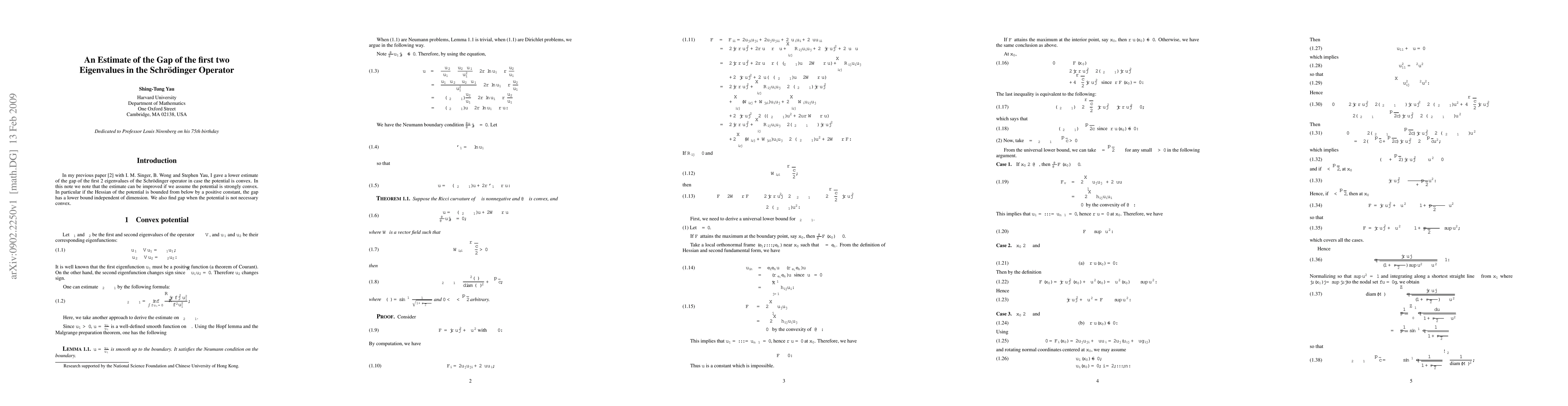 We give a lower estimate of the gap of the first two eigenvalues of the Schrodinger operator in the case when the potential is strongly convex. In particular, if the Hessian of the potential is bounded from below by a positive constant, the gap has a lower bound independent of the dimension. We also estimate the gap when the potential is not necessarily convex.