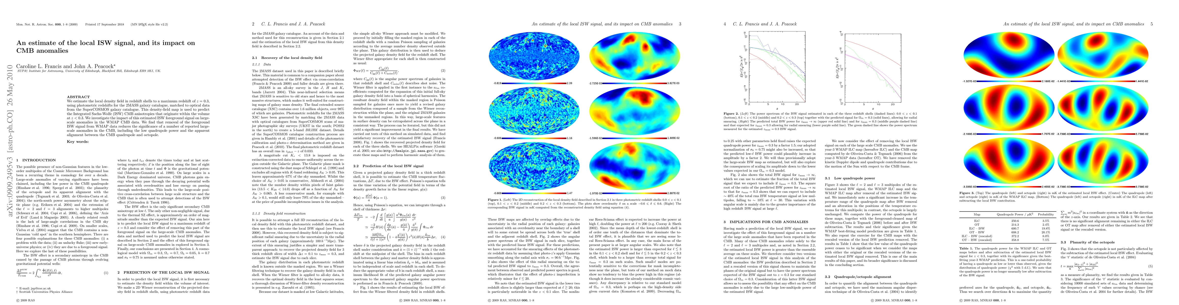We estimate the local density field in redshift shells to a maximum redshift of z=0.3, using photometric redshifts for the 2MASS galaxy catalogue, matched to optical data from the SuperCOSMOS galaxy catalogue. This density-field map is used to predict the Integrated Sachs-Wolfe (ISW) CMB anisotropies that originate within the volume at z<0.3. We investigate the impact of this estimated ISW foreground signal on large-scale anomalies in the WMAP CMB data. We find that removal of the foreground ISW signal from WMAP data reduces the significance of a number of reported large-scale anomalies in the CMB, including the low quadrupole power and the apparent alignment between the CMB quadrupole and octopole.