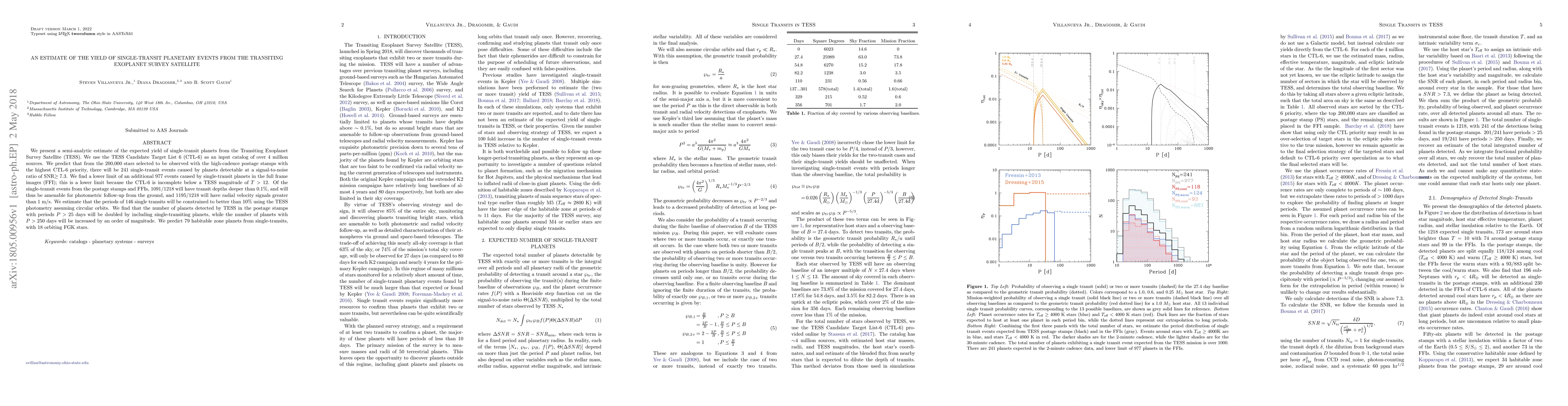 This study estimates the yield of single-transit planetary events from the Transiting Exoplanet Survey Satellite (TESS), predicting 241 detectable single-transit events from high-priority stars and an additional 977 from full frame images. The research highlights the potential for significant follow-up observations and discoveries, including an increase in the detection of long-period planets and 79 habitable zone planets.