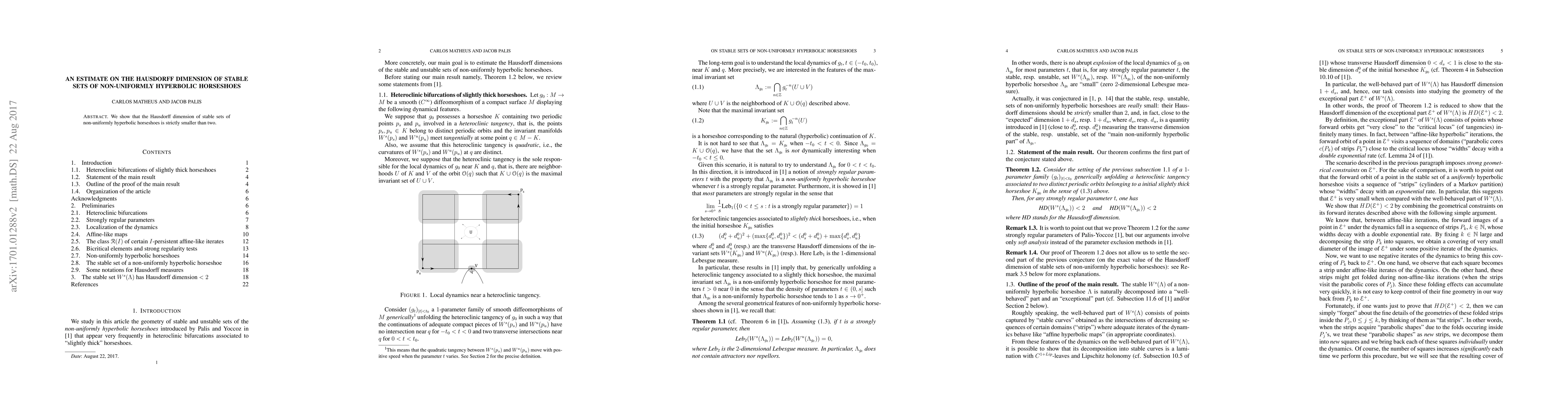 Summary: This paper demonstrates that the Hausdorff dimension of stable sets associated with non-uniformly hyperbolic horseshoes is strictly less than two, providing a new estimate in the study of dynamical systems.