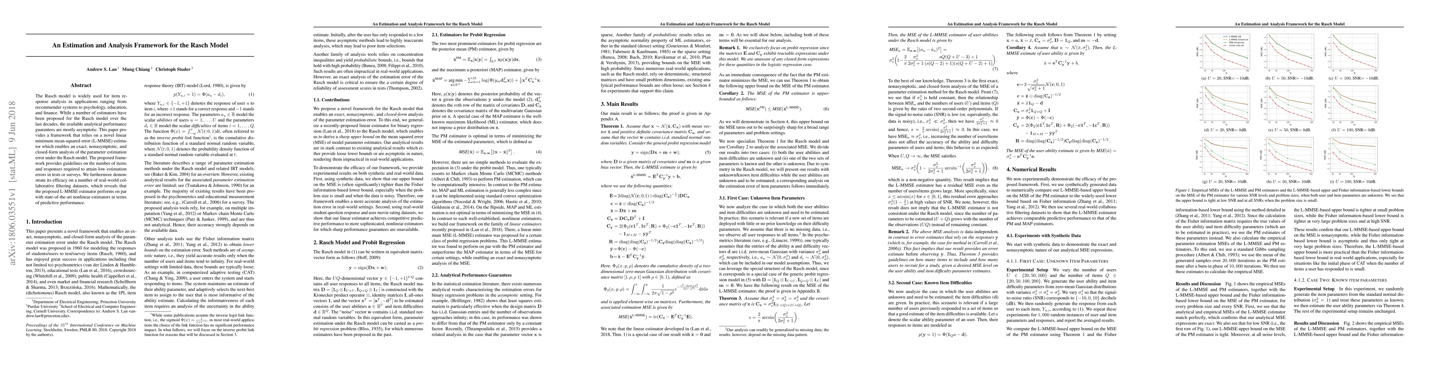 The paper proposes a linear minimum mean-squared error (L-MMSE) estimator for the Rasch model, providing a non-asymptotic, closed-form analysis of parameter estimation error. It contrasts with existing asymptotic results and offers guidelines on the number of items and responses needed for low estimation errors.