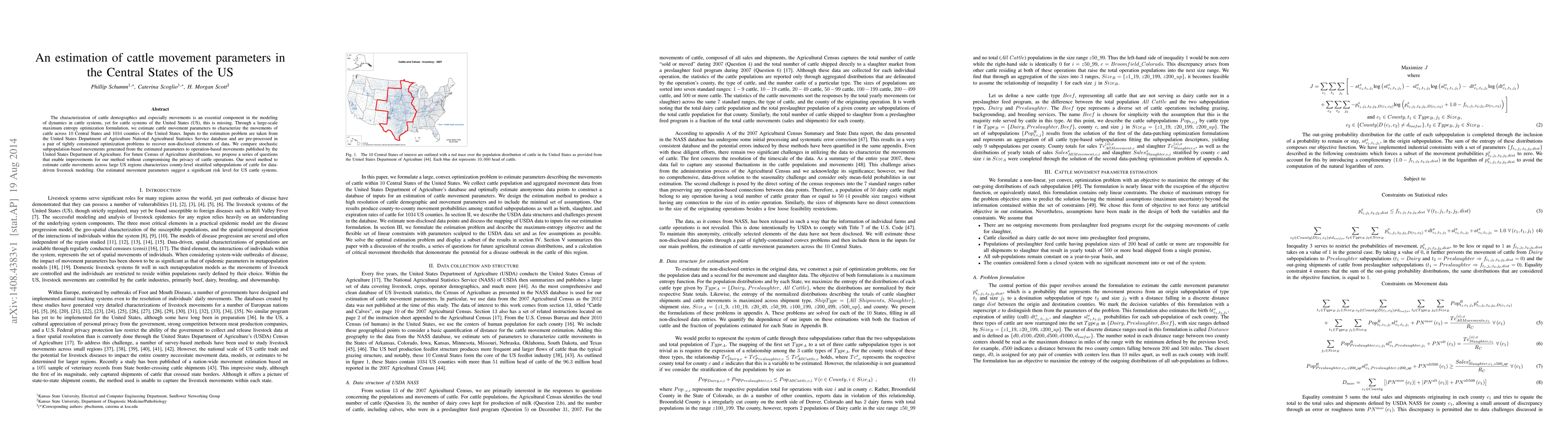 This paper estimates cattle movement parameters across 10 Central States using a maximum entropy optimization method, leveraging USDA data to characterize the dynamics of cattle systems. The study proposes questions for future Census of Agriculture to enhance the method while maintaining privacy.