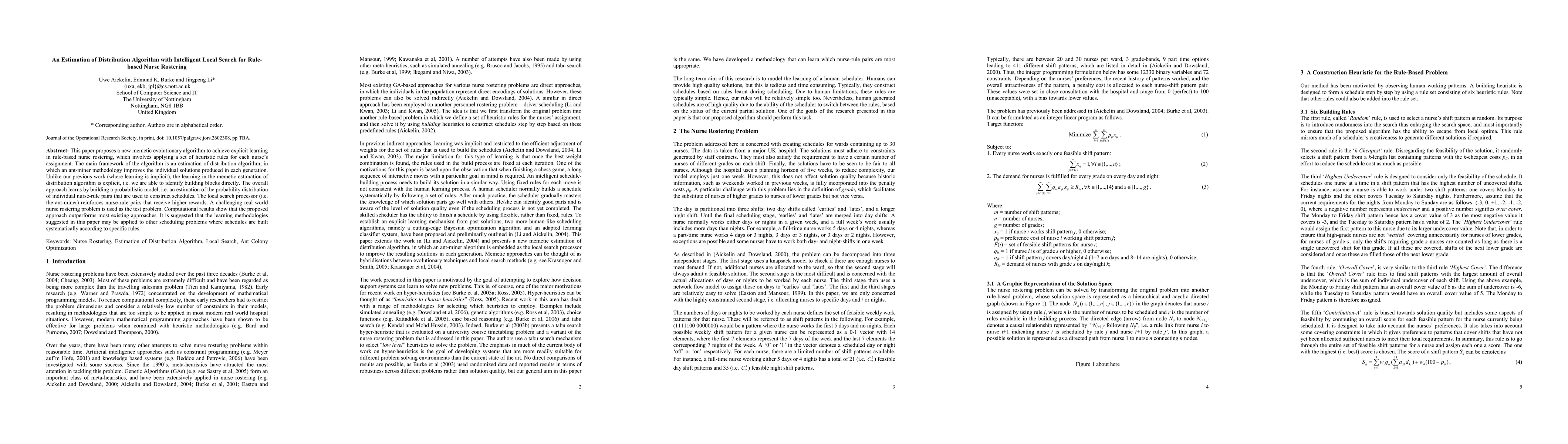 The paper proposes a memetic EDA with an intelligent local search (ant-miner algorithm) for rule-based nurse rostering, learning the probability distribution of nurse-rule pairs explicitly to construct schedules.