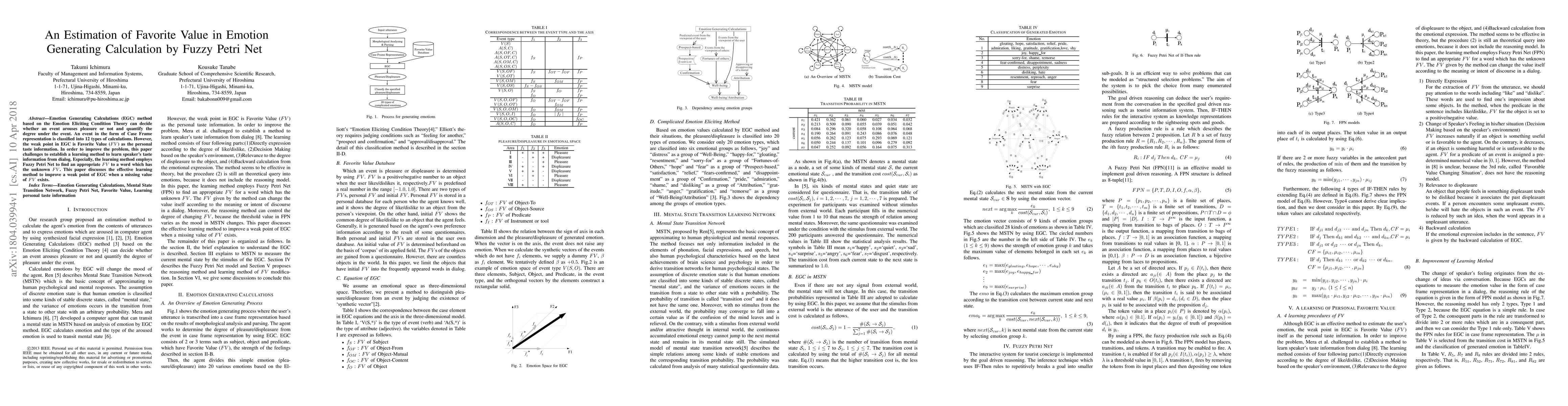 Emotion Generating Calculations (EGC) method based on the Emotion Eliciting Condition Theory can decide whether an event arouses pleasure or not and quantify the degree under the event. An event in the form of Case Frame representation is classified into 12 types of calculations. However, the weak point in EGC is Favorite Value (FV) as the personal taste information. In order to improve the problem, this paper challenges to establish a learning method to learn speaker's taste information from dialog. Especially, the learning method employs Fuzzy Petri Net to find an appropriate FV to a word which has the unknown FV. This paper discusses the effective learning method to improve a weak point of EGC when a missing value of FV exists.