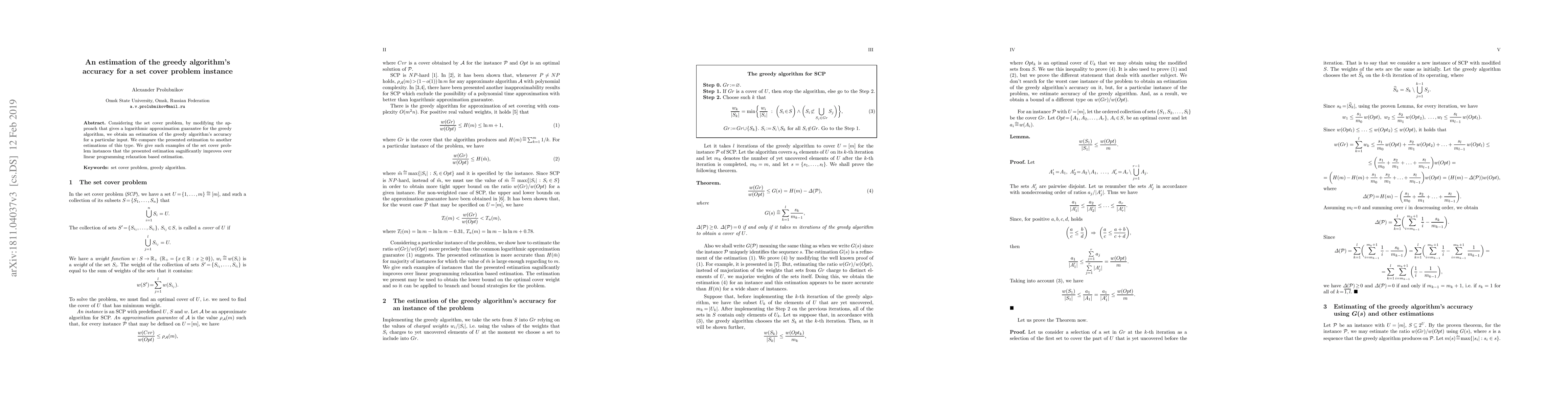 The paper estimates the accuracy of the greedy algorithm for set cover problems using a modified approach that provides a logarithmic approximation guarantee, significantly improving over linear programming relaxation-based estimations.