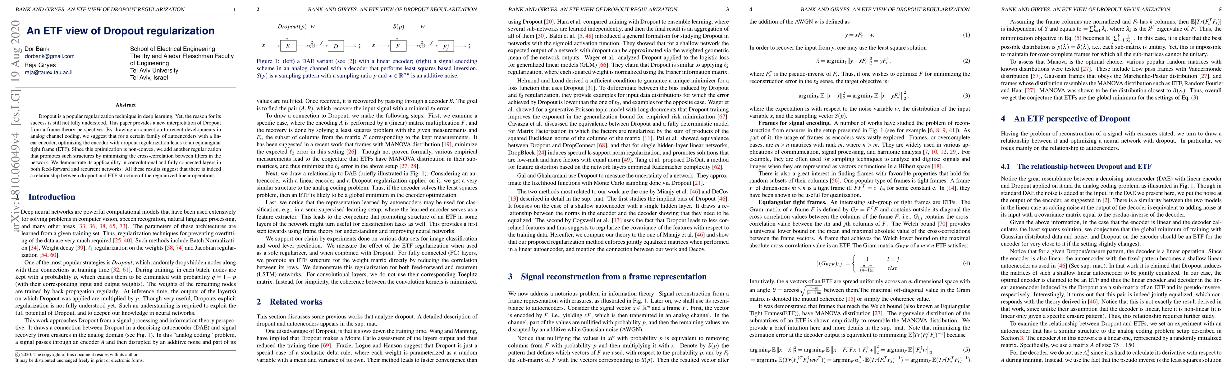 Dropout is a popular regularization technique in deep learning. Yet, the reason for its success is still not fully understood. This paper provides a new interpretation of Dropout from a frame theory perspective. By drawing a connection to recent developments in analog channel coding, we suggest that for a certain family of autoencoders with a linear encoder, optimizing the encoder with dropout regularization leads to an equiangular tight frame (ETF). Since this optimization is non-convex, we add another regularization that promotes such structures by minimizing the cross-correlation between filters in the network. We demonstrate its applicability in convolutional and fully connected layers in both feed-forward and recurrent networks. All these results suggest that there is indeed a relationship between dropout and ETF structure of the regularized linear operations.