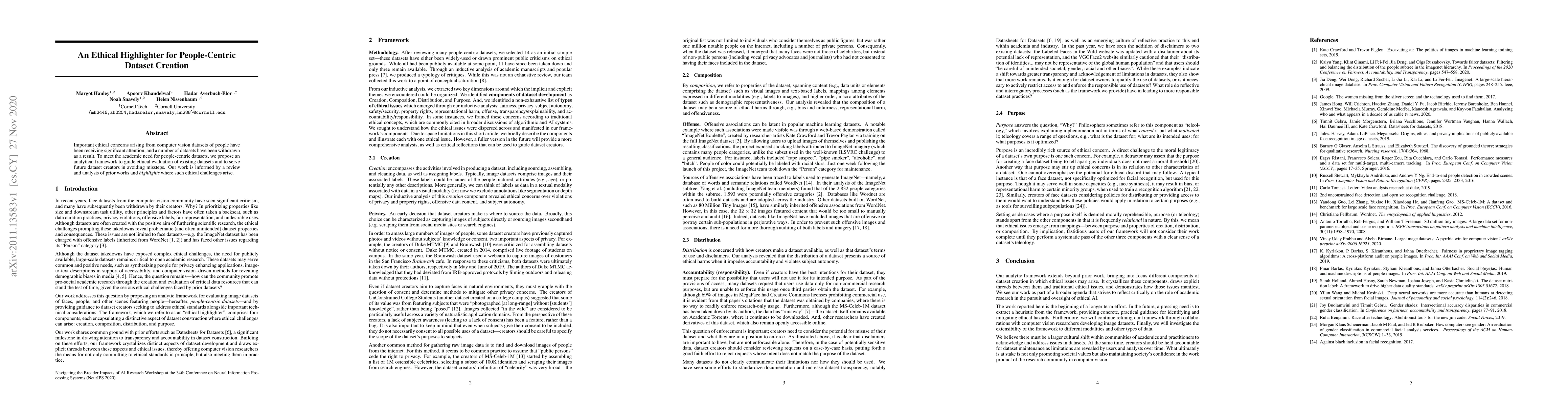 Important ethical concerns arising from computer vision datasets of people have been receiving significant attention, and a number of datasets have been withdrawn as a result. To meet the academic need for people-centric datasets, we propose an analytical framework to guide ethical evaluation of existing datasets and to serve future dataset creators in avoiding missteps. Our work is informed by a review and analysis of prior works and highlights where such ethical challenges arise.