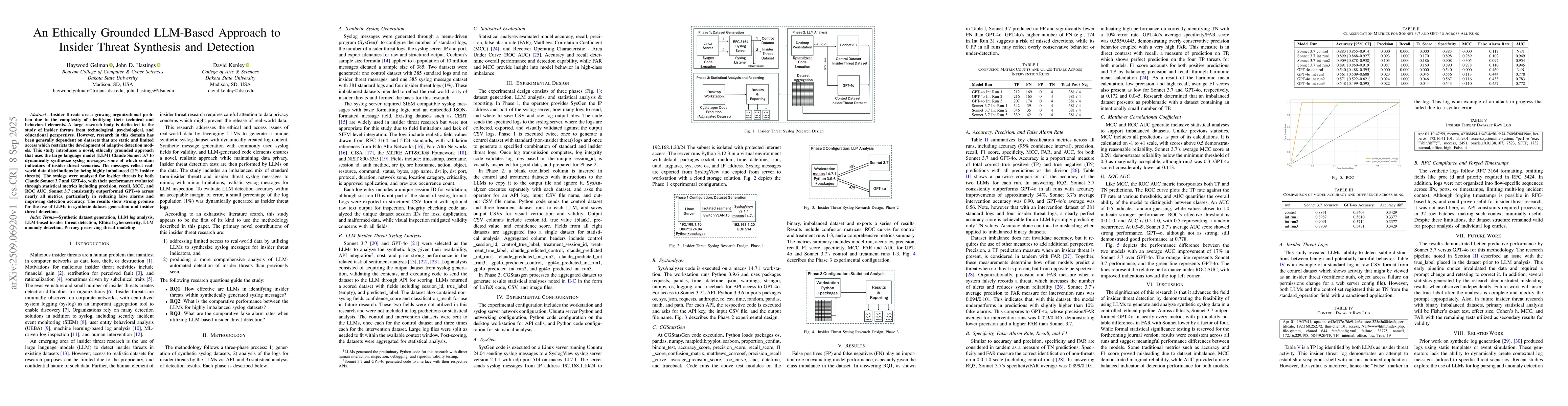 Insider threats are a growing organizational problem due to the complexity of identifying their technical and behavioral elements. A large research body is dedicated to the study of insider threats from technological, psychological, and educational perspectives. However, research in this domain has been generally dependent on datasets that are static and limited access which restricts the development of adaptive detection models. This study introduces a novel, ethically grounded approach that uses the large language model (LLM) Claude Sonnet 3.7 to dynamically synthesize syslog messages, some of which contain indicators of insider threat scenarios. The messages reflect real-world data distributions by being highly imbalanced (1% insider threats). The syslogs were analyzed for insider threats by both Claude Sonnet 3.7 and GPT-4o, with their performance evaluated through statistical metrics including precision, recall, MCC, and ROC AUC. Sonnet 3.7 consistently outperformed GPT-4o across nearly all metrics, particularly in reducing false alarms and improving detection accuracy. The results show strong promise for the use of LLMs in synthetic dataset generation and insider threat detection.