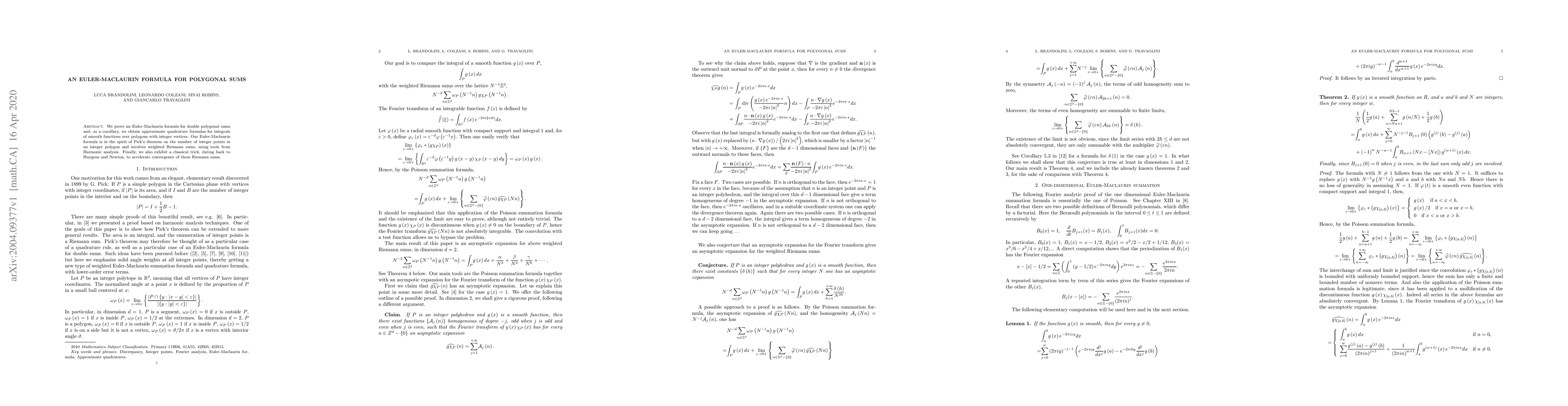 This paper proves an Euler-Maclaurin formula for double polygonal sums, leading to approximate quadrature formulas for integrals over polygons with integer vertices. It employs techniques from Harmonic analysis and includes a convergence acceleration method reminiscent of Huygens and Newton.