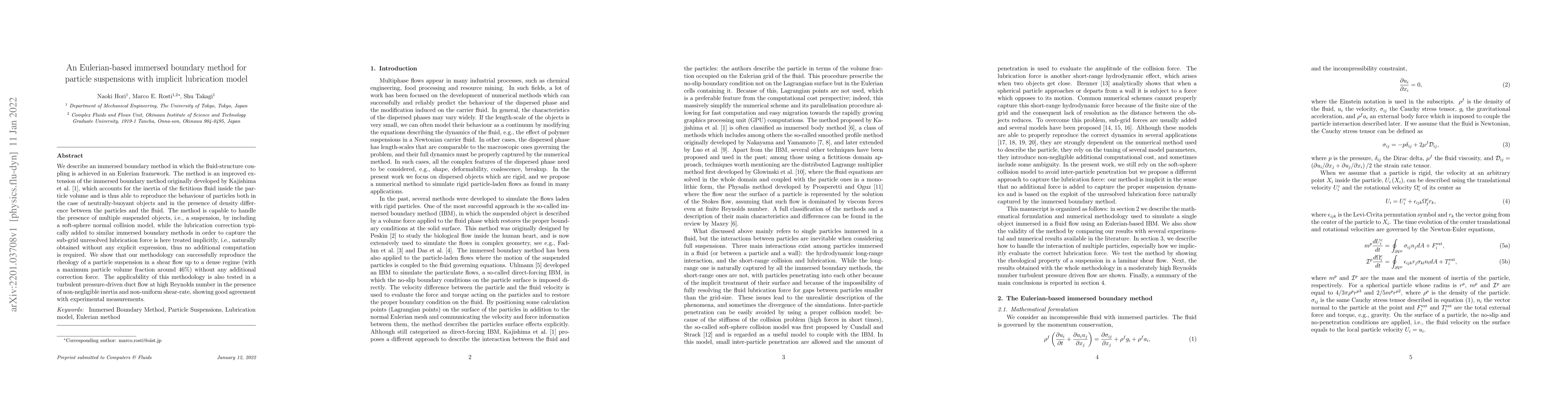 This paper presents an advanced Eulerian-based immersed boundary method for simulating particle suspensions, incorporating fluid-structure coupling and implicit lubrication modeling to handle multiple suspended particles and dense regimes without additional computational costs. The method successfully reproduces the rheology of particle suspensions in shear flows and turbulent duct flows.
