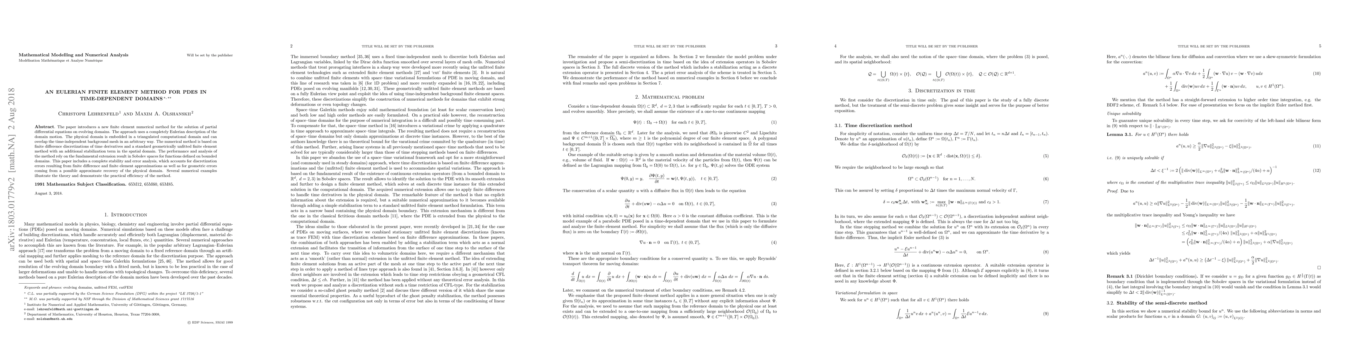 This paper presents a novel Eulerian finite element method for solving PDEs in time-dependent domains, employing a triangulated computational domain and a geometrically unfitted approach. It provides a stability and error analysis, and demonstrates practical efficiency through numerical examples.