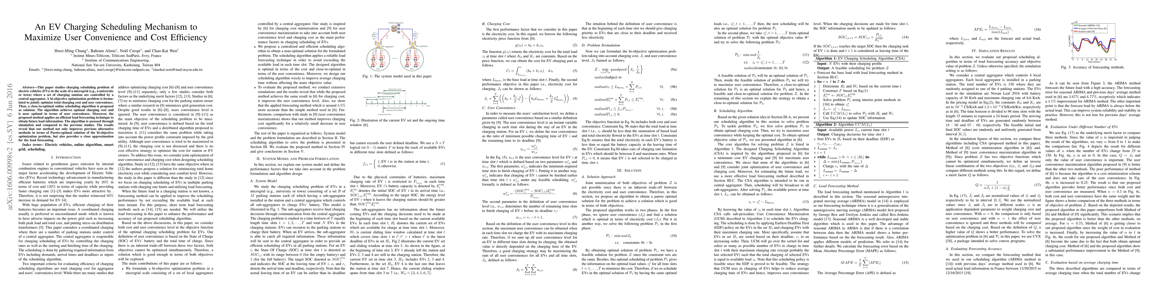 This paper studies charging scheduling problem of electric vehicles (EVs) in the scale of a microgrid (e.g., a university or town) where a set of charging stations are controlled by a central aggregator. A bi-objective optimization problem is formulated to jointly optimize total charging cost and user convenience. Then, a close-to-optimal online scheduling algorithm is proposed as solution. The algorithm achieves optimal charging cost and is near optimal in terms of user convenience. Moreover, the proposed method applies an efficient load forecasting technique to obtain future load information. The algorithm is assessed through simulation and compared to the previous studies. The results reveal that our method not only improves previous alternative methods in terms of Pareto-optimal solution of the bi-objective optimization problem, but also provides a close approximation for the load forecasting.