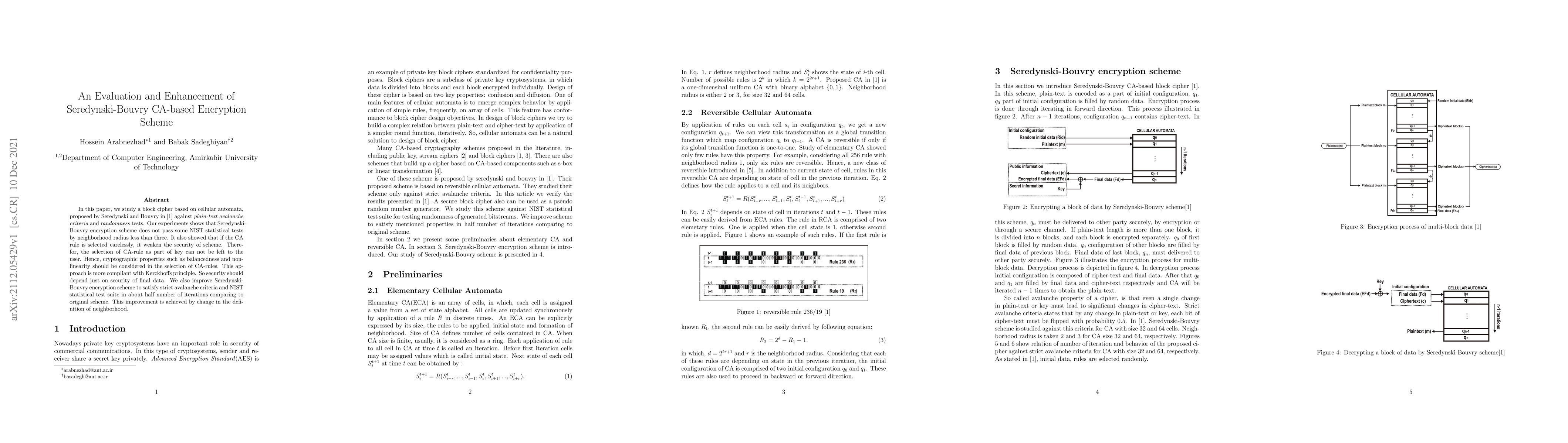 In this paper, we study a block cipher based on cellular automata, proposed by Seredynski and Bouvry in \cite{semabo04} against \emph{plain-text avalanche criteria} and \emph{randomness} tests. Our experiments shows that Seredynski-Bouvry encryption scheme does not pass some NIST statistical tests by neighborhood radius less than three. It also showed that if the CA rule is selected carelessly, it weaken the security of scheme. Therefor, the selection of CA-rule as part of key can not be left to the user. Hence, cryptographic properties such as balancedness and non-linearity should be considered in the selection of CA-rules. This approach is more compliant with Kerckhoffs principle. So security should depend just on security of final data. We also improve Seredynski-Bouvry encryption scheme to satisfy strict avalanche criteria and NIST statistical test suite in about half number of iterations comparing to original scheme. This improvement is achieved by change in the definition of neighborhood.
