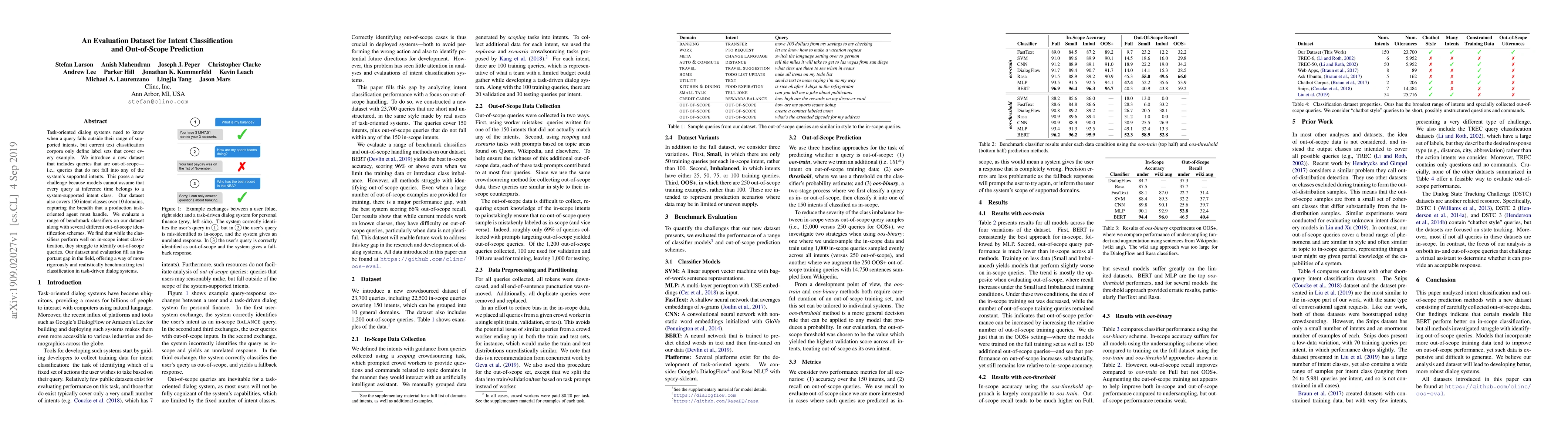 This paper introduces a new dataset for evaluating intent classification and out-of-scope prediction in task-oriented dialog systems, addressing the lack of data for queries outside supported intents. The dataset, covering 150 intent classes across 10 domains, reveals that while classifiers excel at in-scope intents, they struggle with identifying out-of-scope queries, highlighting a critical gap in current benchmarks.