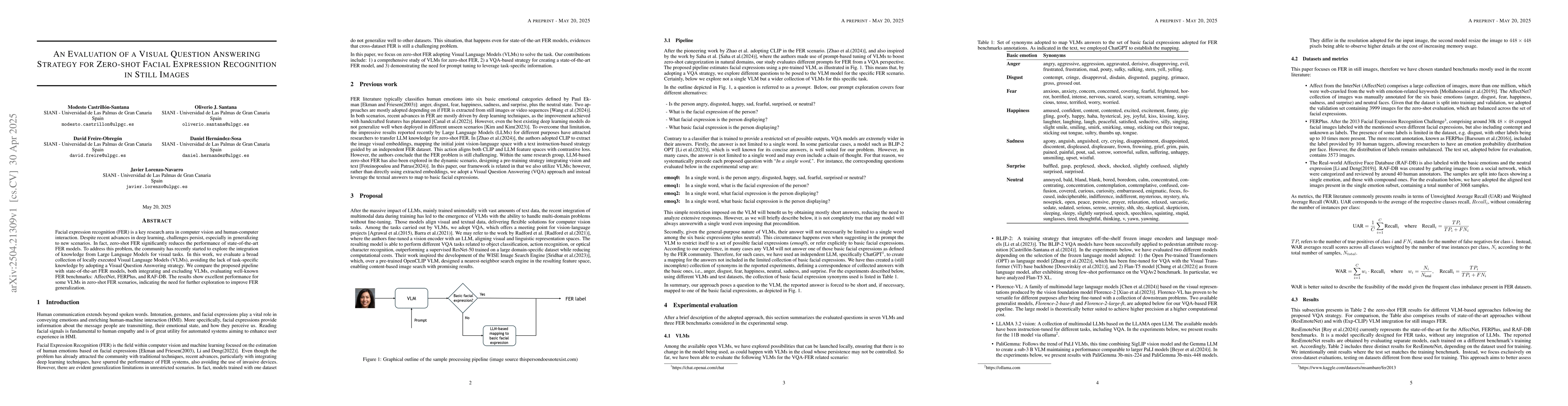 The primary technical contribution is the application of a Visual Question Answering strategy with locally executed VLMs for zero-shot FER, showcasing promising results that outperform some state-of-the-art FER models.
