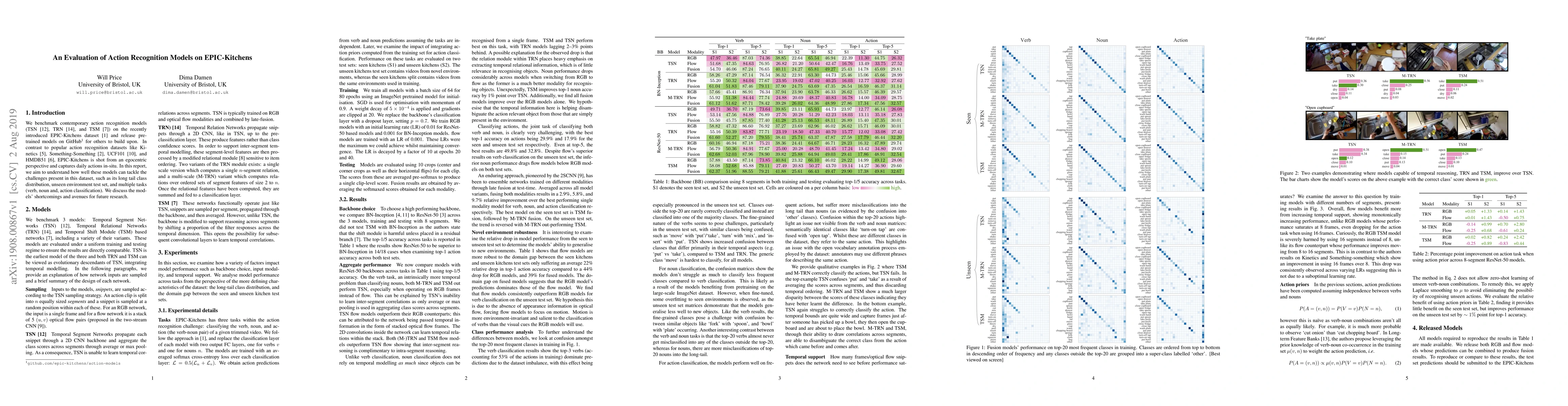 We benchmark contemporary action recognition models (TSN, TRN, and TSM) on the recently introduced EPIC-Kitchens dataset and release pretrained models on GitHub (https://github.com/epic-kitchens/action-models) for others to build upon. In contrast to popular action recognition datasets like Kinetics, Something-Something, UCF101, and HMDB51, EPIC-Kitchens is shot from an egocentric perspective and captures daily actions in-situ. In this report, we aim to understand how well these models can tackle the challenges present in this dataset, such as its long tail class distribution, unseen environment test set, and multiple tasks (verb, noun and, action classification). We discuss the models' shortcomings and avenues for future research.