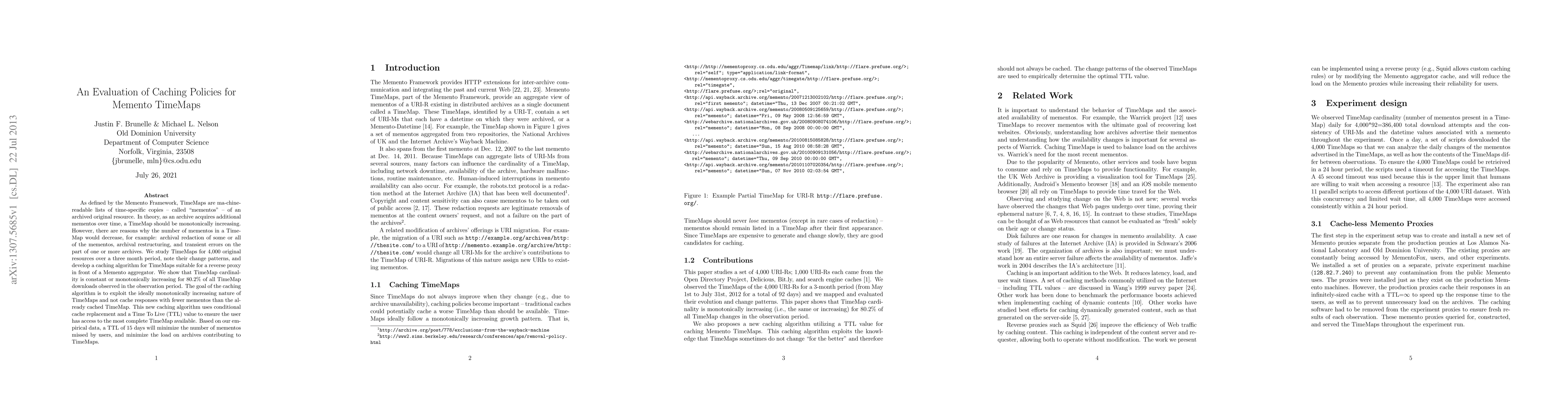 This paper evaluates caching policies for Memento TimeMaps, which are lists of time-specific copies of archived resources. The study finds that TimeMap cardinality is mostly increasing, and proposes a caching algorithm to exploit this trend, minimizing missed mementos and reducing archive load with a TTL of 15 days.