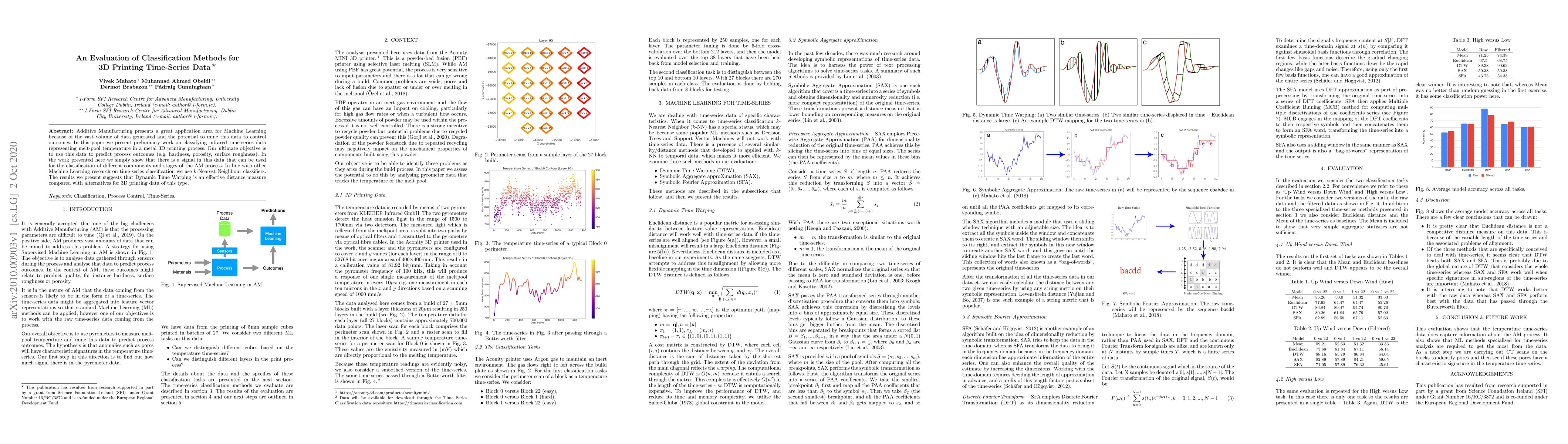 Additive Manufacturing presents a great application area for Machine Learning because of the vast volume of data generated and the potential to mine this data to control outcomes. In this paper we present preliminary work on classifying infrared time-series data representing melt-pool temperature in a metal 3D printing process. Our ultimate objective is to use this data to predict process outcomes (e.g. hardness, porosity, surface roughness). In the work presented here we simply show that there is a signal in this data that can be used for the classification of different components and stages of the AM process. In line with other Machine Learning research on time-series classification we use k-Nearest Neighbour classifiers. The results we present suggests that Dynamic Time Warping is an effective distance measure compared with alternatives for 3D printing data of this type.