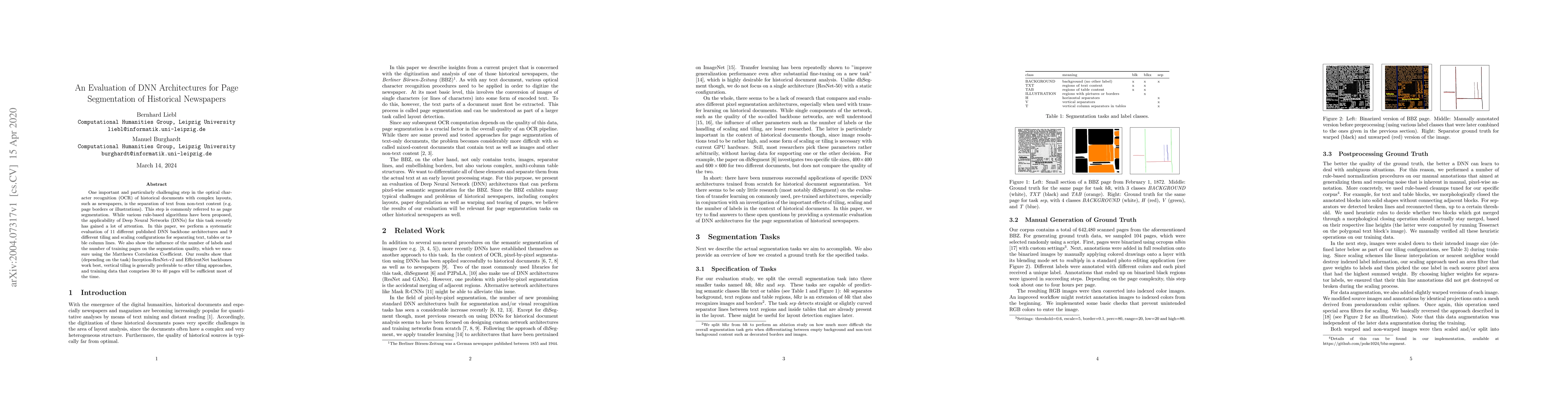 One important and particularly challenging step in the optical character recognition (OCR) of historical documents with complex layouts, such as newspapers, is the separation of text from non-text content (e.g. page borders or illustrations). This step is commonly referred to as page segmentation. While various rule-based algorithms have been proposed, the applicability of Deep Neural Networks (DNNs) for this task recently has gained a lot of attention. In this paper, we perform a systematic evaluation of 11 different published DNN backbone architectures and 9 different tiling and scaling configurations for separating text, tables or table column lines. We also show the influence of the number of labels and the number of training pages on the segmentation quality, which we measure using the Matthews Correlation Coefficient. Our results show that (depending on the task) Inception-ResNet-v2 and EfficientNet backbones work best, vertical tiling is generally preferable to other tiling approaches, and training data that comprises 30 to 40 pages will be sufficient most of the time.